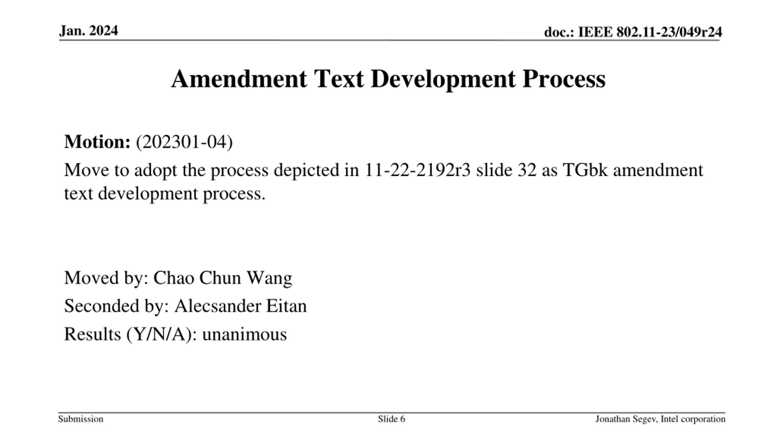 Jan. 2024 doc.: IEEE 802.11-23/049r24 Amendment Text Development Process Motion: (202301-04) Move to adopt the process depicted in 11-22-2192r3 slide 32 as TGbk amendment text development process. Moved by: Chao Chun Wang Seconded by: Alecsander Eitan Results (Y/N/A): unanimous Submission Slide 6 Jonathan Segev, Intel corporation