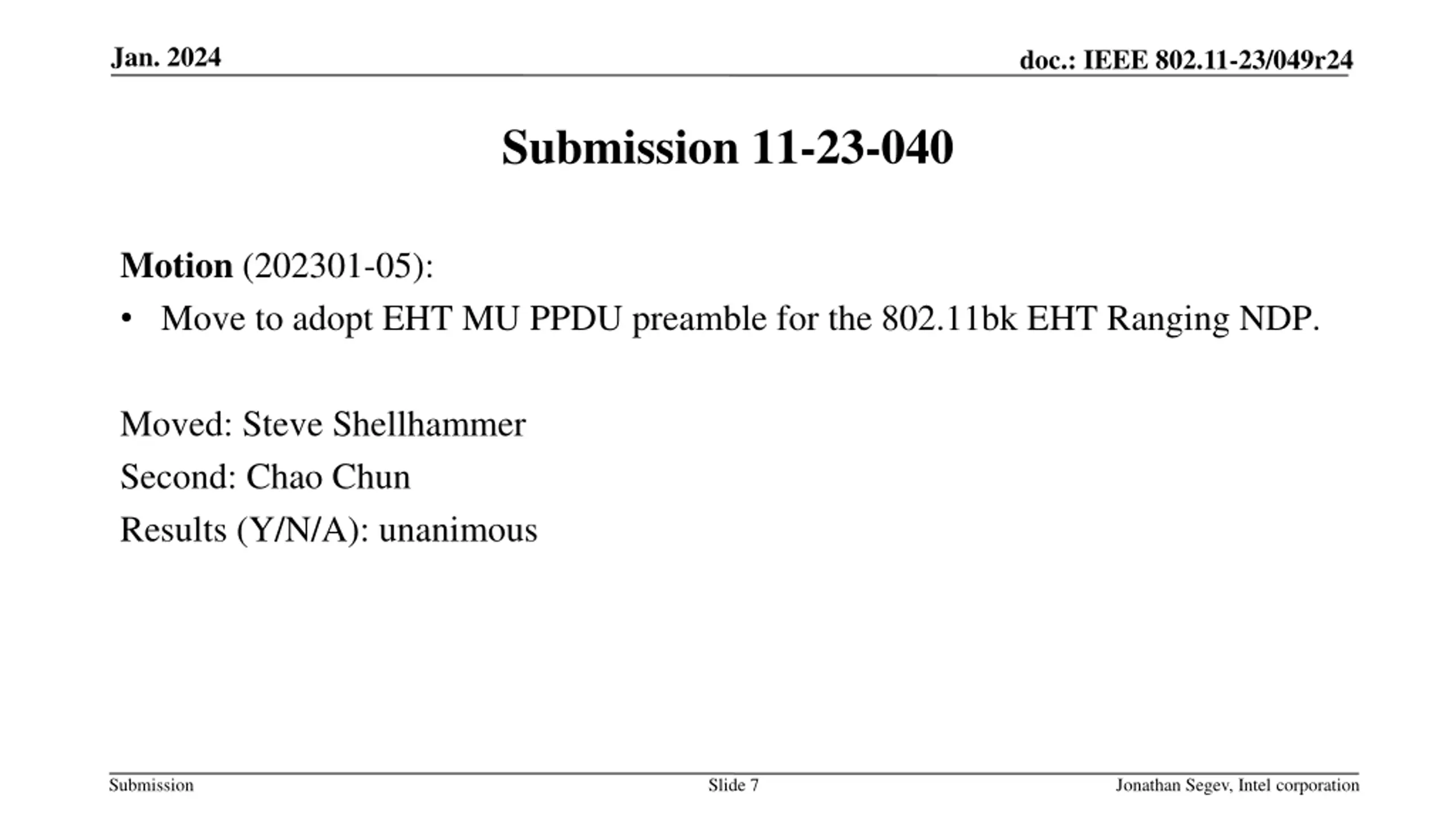 Jan. 2024 doc.: IEEE 802.11-23/049r24 Submission 11-23-040 Motion (202301-05): Move to adopt EHT MU PPDU preamble for the 802.11bk EHT Ranging NDP. Moved: Steve Shellhammer Second: Chao Chun Results (Y/N/A): unanimous Submission Slide 7 Jonathan Segev, Intel corporation