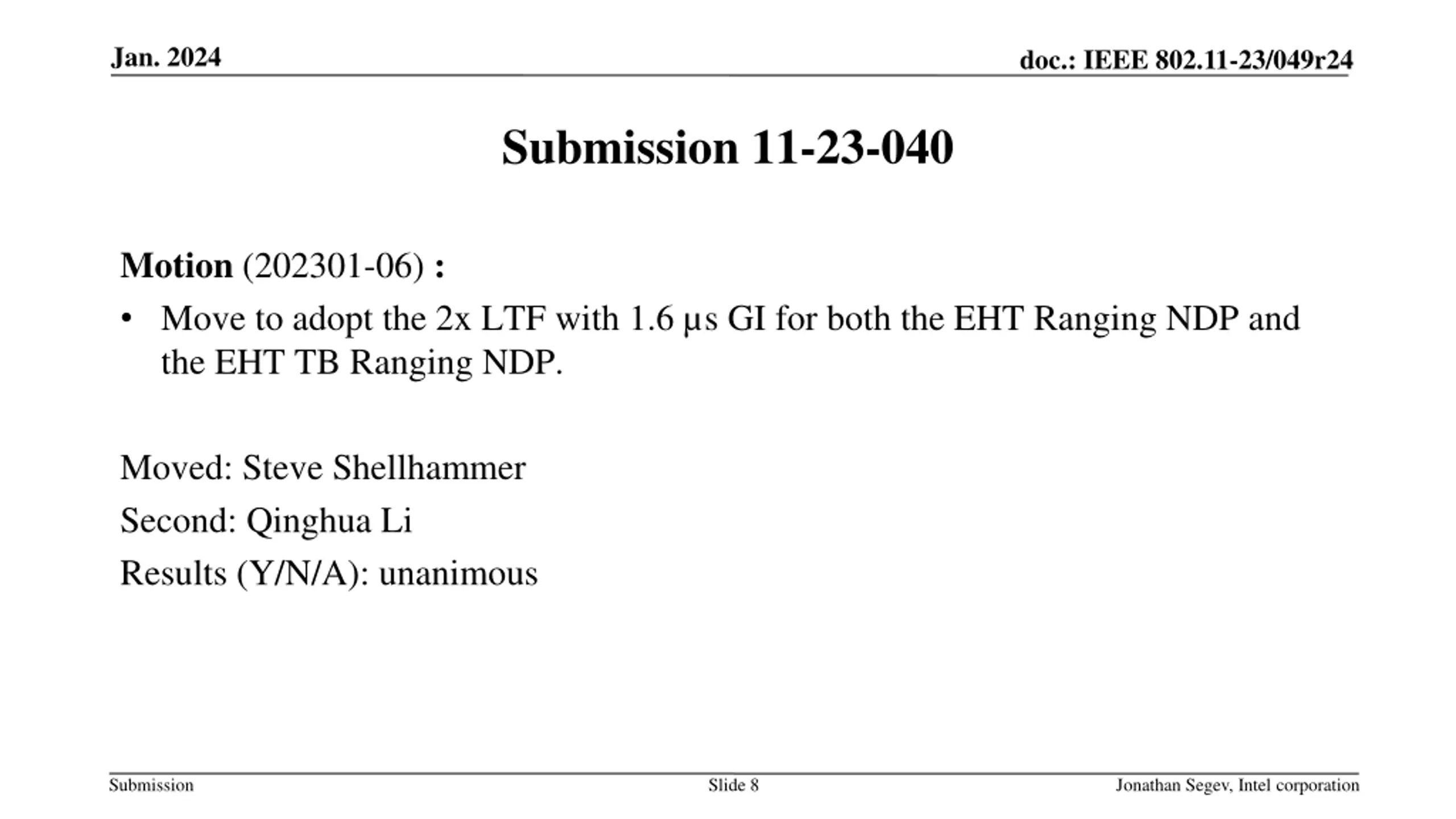 Jan. 2024 doc.: IEEE 802.11-23/049r24 Submission 11-23-040 Motion (202301-06) : Move to adopt the 2x LTF with 1.6 s GI for both the EHT Ranging NDP and the EHT TB Ranging NDP. Moved: Steve Shellhammer Second: Qinghua Li Results (Y/N/A): unanimous Submission Slide 8 Jonathan Segev, Intel corporation