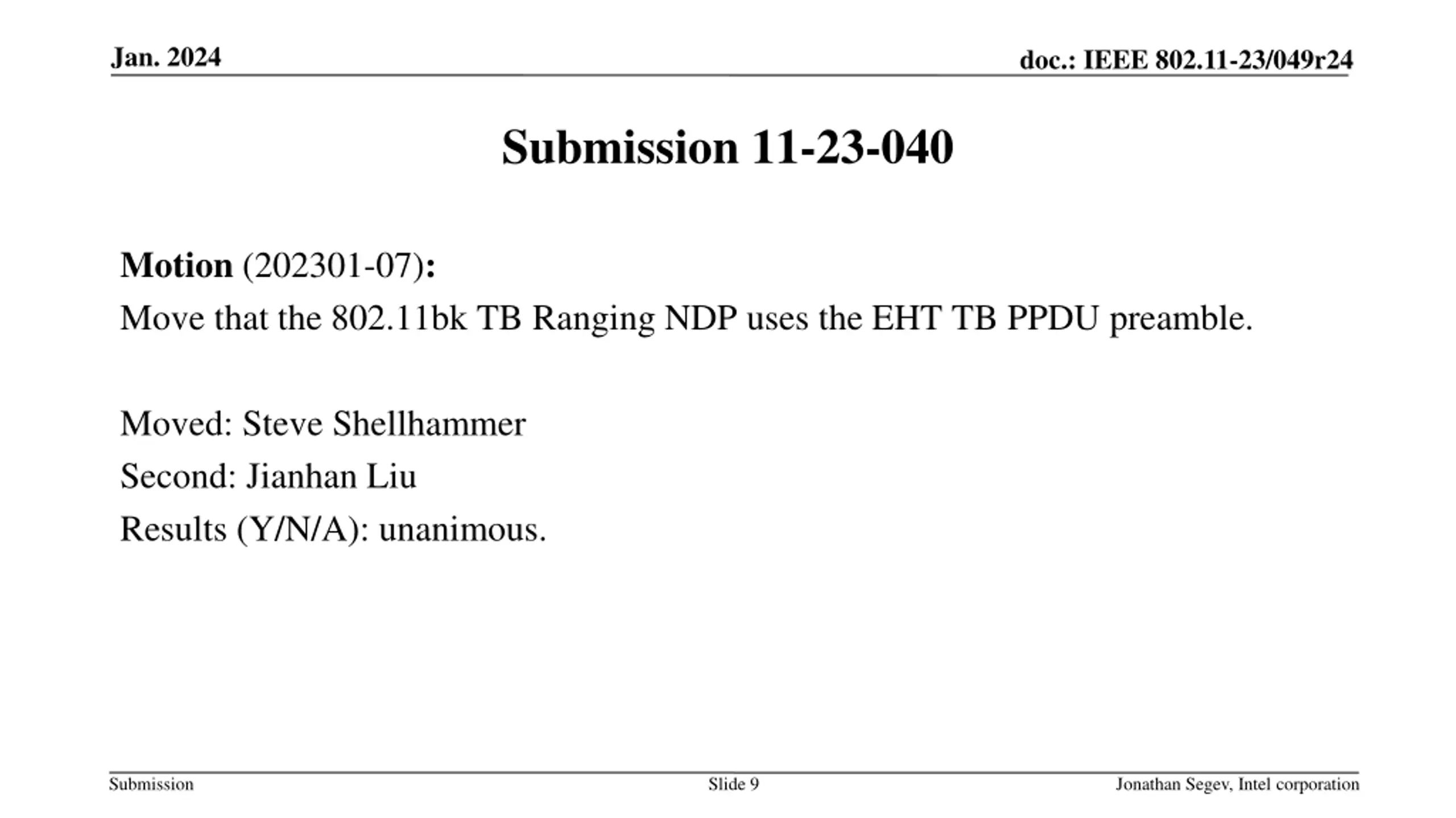 Jan. 2024 doc.: IEEE 802.11-23/049r24 Submission 11-23-040 Motion (202301-07): Move that the 802.11bk TB Ranging NDP uses the EHT TB PPDU preamble. Moved: Steve Shellhammer Second: Jianhan Liu Results (Y/N/A): unanimous. Submission Slide 9 Jonathan Segev, Intel corporation