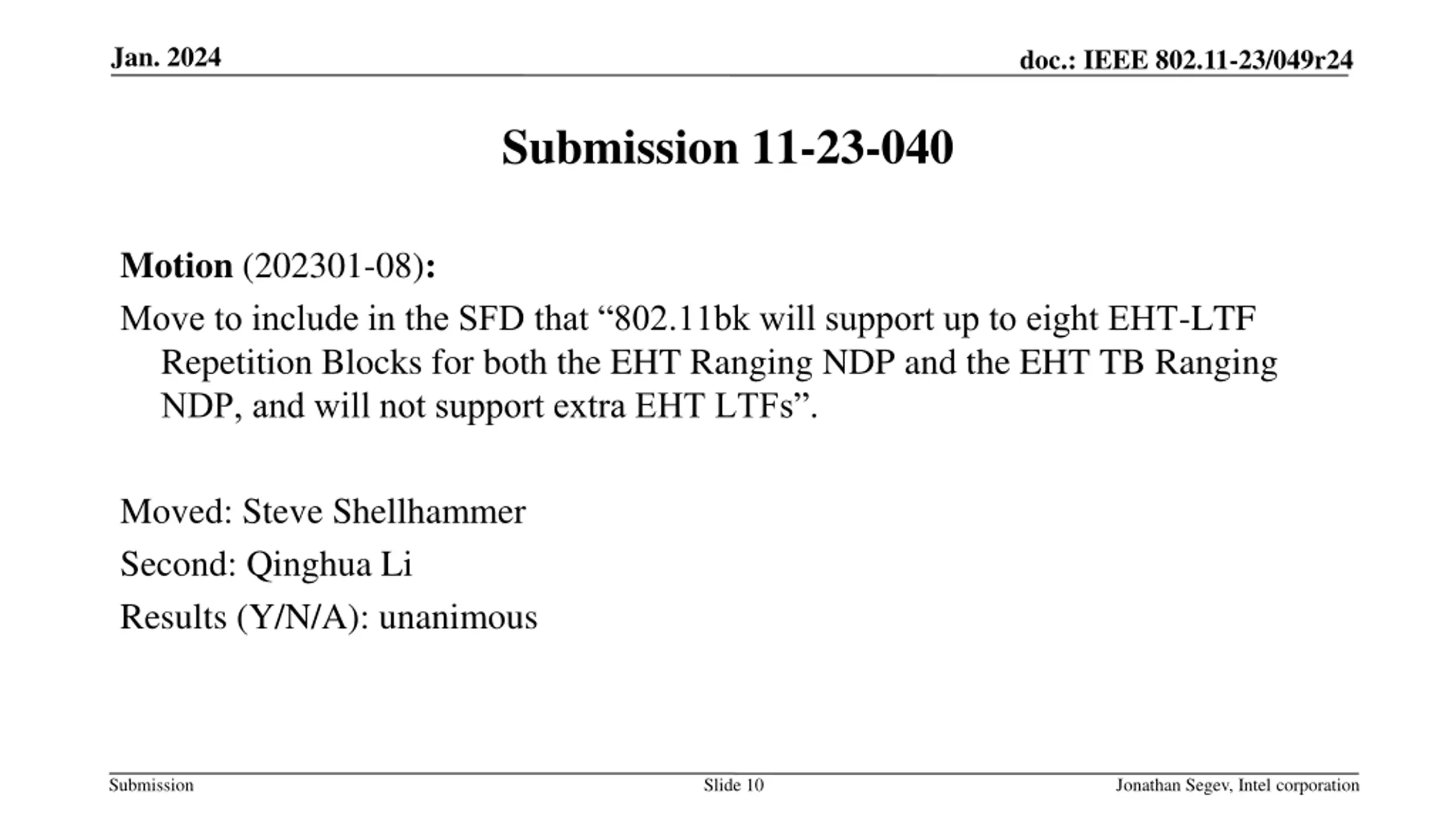 Jan. 2024 doc.: IEEE 802.11-23/049r24 Submission 11-23-040 Motion (202301-08): Move to include in the SFD that 802.11bk will support up to eight EHT-LTF Repetition Blocks for both the EHT Ranging NDP and the EHT TB Ranging NDP, and will not support extra EHT LTFs . Moved: Steve Shellhammer Second: Qinghua Li Results (Y/N/A): unanimous Submission Slide 10 Jonathan Segev, Intel corporation