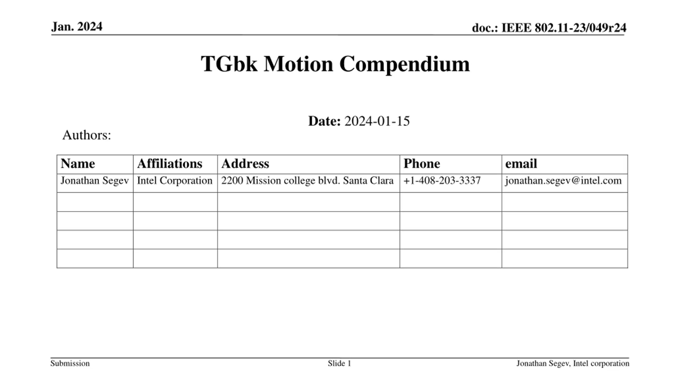 Jan. 2024 doc.: IEEE 802.11-23/049r24 TGbk Motion Compendium Date: 2024-01-15 Authors: Name Jonathan Segev Intel Corporation 2200 Mission college blvd. Santa Clara +1-408-203-3337 Affiliations Address Phone email jonathan.segev@intel.com Submission Slide 1 Jonathan Segev, Intel corporation