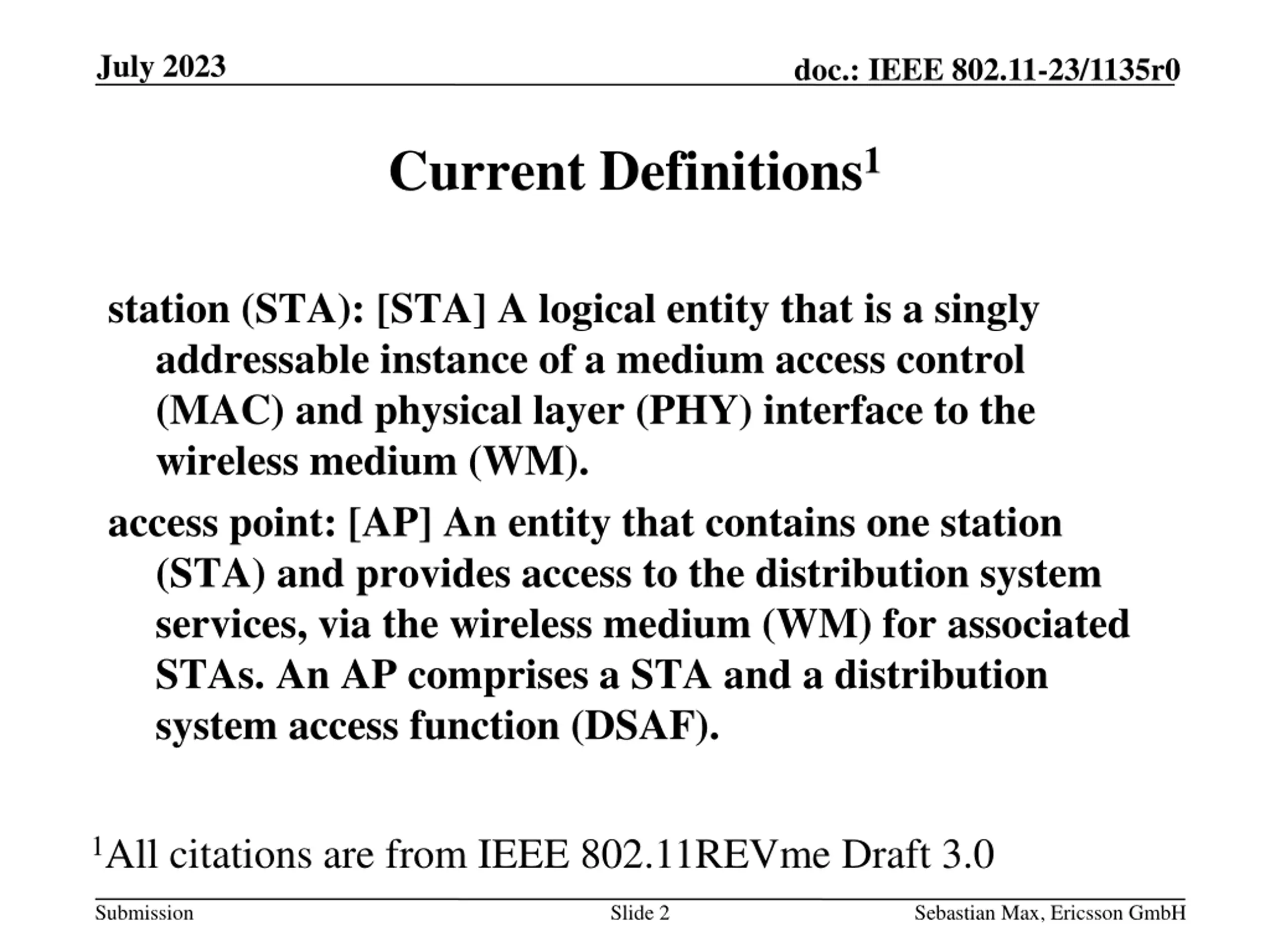 July 2023 doc.: IEEE 802.11-23/1135r0 Current Definitions1 station (STA): [STA] A logical entity that is a singly addressable instance of a medium access control (MAC) and physical layer (PHY) interface to the wireless medium (WM). access point: [AP] An entity that contains one station (STA) and provides access to the distribution system services, via the wireless medium (WM) for associated STAs. An AP comprises a STA and a distribution system access function (DSAF). 1All citations are from IEEE 802.11REVme Draft 3.0 Submission Slide 2 Sebastian Max, Ericsson GmbH