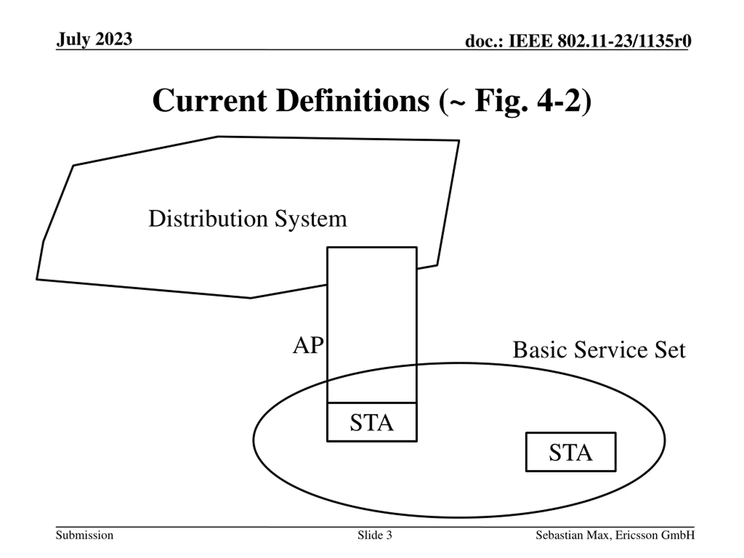 July 2023 doc.: IEEE 802.11-23/1135r0 Current Definitions (~ Fig. 4-2) Distribution System AP Basic Service Set STA STA Submission Slide 3 Sebastian Max, Ericsson GmbH