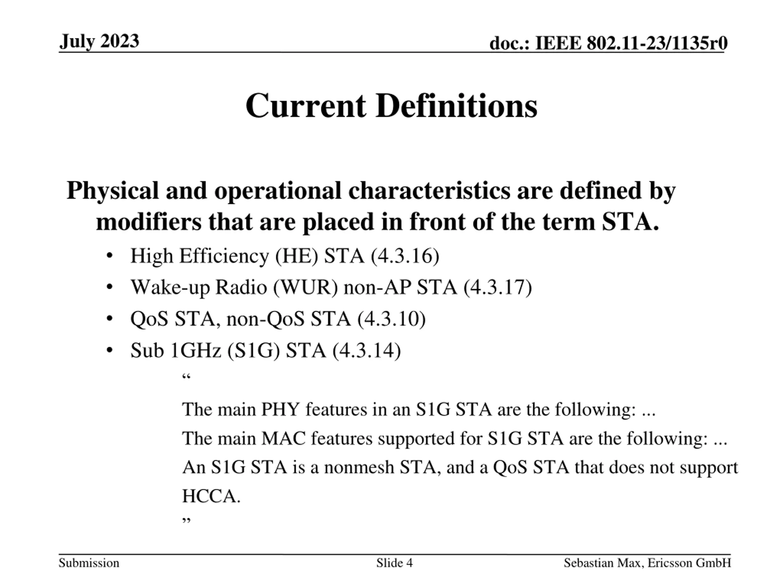 July 2023 doc.: IEEE 802.11-23/1135r0 Current Definitions Physical and operational characteristics are defined by modifiers that are placed in front of the term STA. High Efficiency (HE) STA (4.3.16) Wake-up Radio (WUR) non-AP STA (4.3.17) QoS STA, non-QoS STA (4.3.10) Sub 1GHz (S1G) STA (4.3.14) The main PHY features in an S1G STA are the following: ... The main MAC features supported for S1G STA are the following: ... An S1G STA is a nonmesh STA, and a QoS STA that does not support HCCA. Submission Slide 4 Sebastian Max, Ericsson GmbH