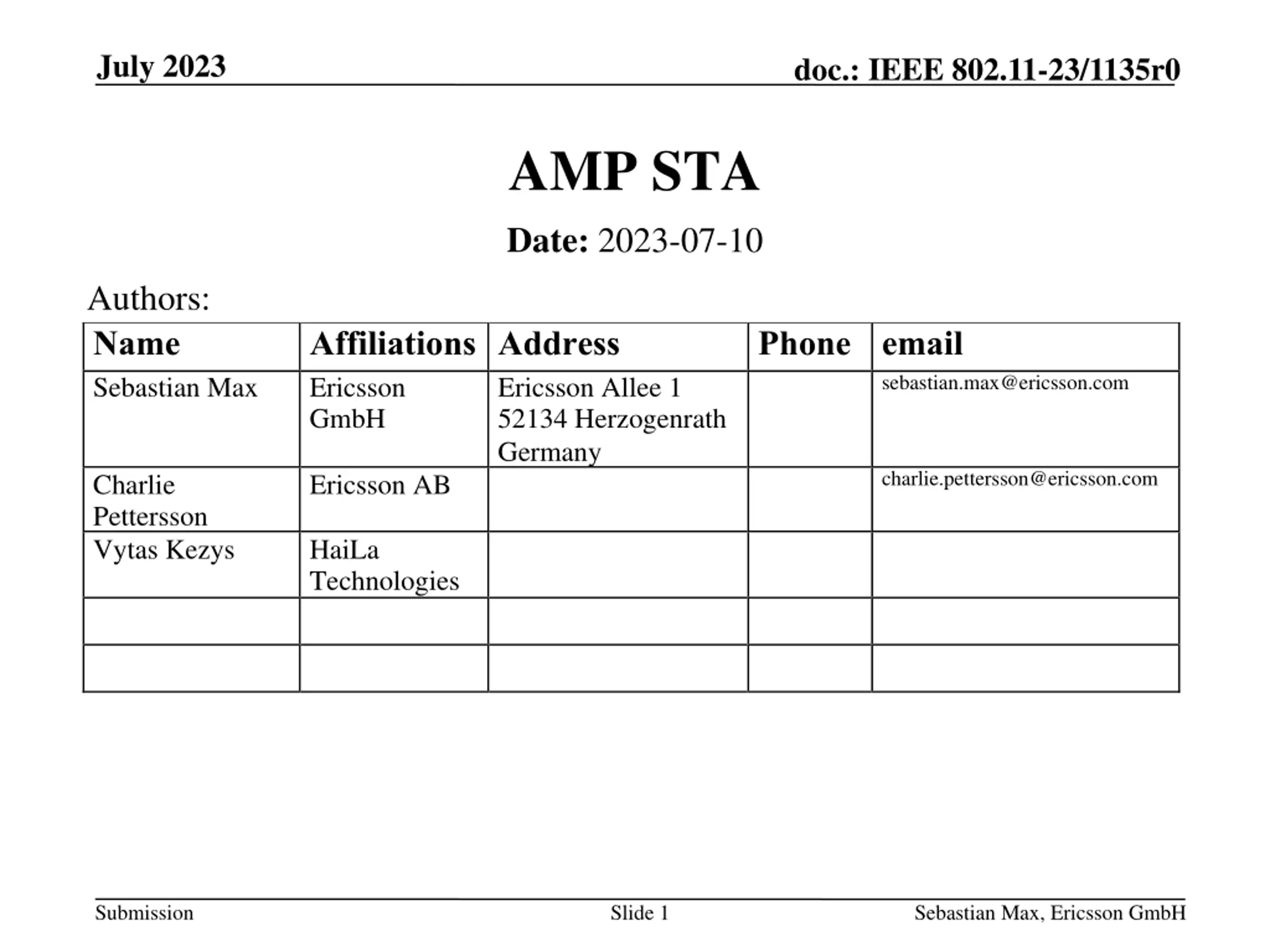 July 2023 doc.: IEEE 802.11-23/1135r0 AMP STA Date: 2023-07-10 Authors: Name Sebastian Max Affiliations Address Ericsson GmbH Phone email sebastian.max@ericsson.com Ericsson Allee 1 52134 Herzogenrath Germany charlie.pettersson@ericsson.com Charlie Pettersson Vytas Kezys Ericsson AB HaiLa Technologies Submission Slide 1 Sebastian Max, Ericsson GmbH