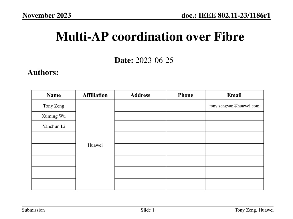 November 2023 doc.: IEEE 802.11-23/1186r1 Multi-AP coordination over Fibre Date: 2023-06-25 Authors: Name Affiliation Address Phone Email Tony Zeng tony.zengyan@huawei.com Xuming Wu Yanchun Li Huawei Submission Slide 1 Tony Zeng, Huawei