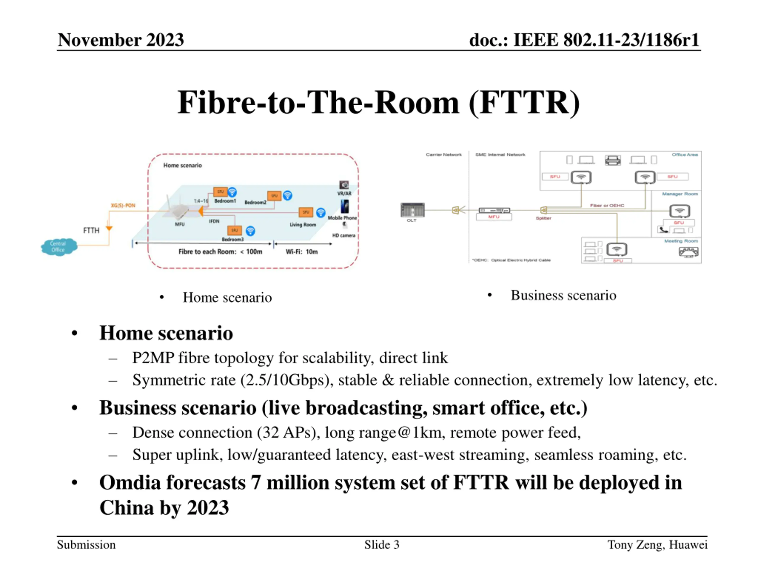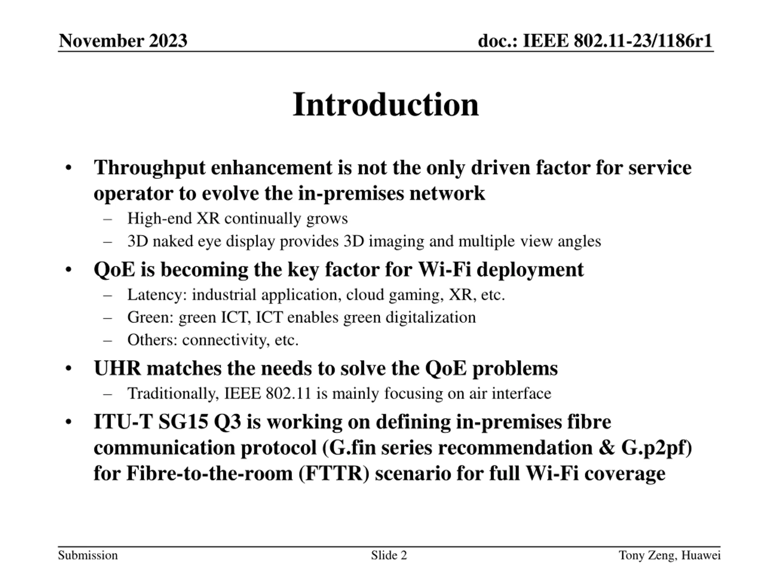 November 2023 doc.: IEEE 802.11-23/1186r1 Introduction Throughput enhancement is not the only driven factor for service operator to evolve the in-premises network High-end XR continually grows 3D naked eye display provides 3D imaging and multiple view angles QoE is becoming the key factor for Wi-Fi deployment Latency: industrial application, cloud gaming, XR, etc. Green: green ICT, ICT enables green digitalization Others: connectivity, etc. UHR matches the needs to solve the QoE problems Traditionally, IEEE 802.11 is mainly focusing on air interface ITU-T SG15 Q3 is working on defining in-premises fibre communication protocol (G.fin series recommendation & G.p2pf) for Fibre-to-the-room (FTTR) scenario for full Wi-Fi coverage Submission Slide 2 Tony Zeng, Huawei