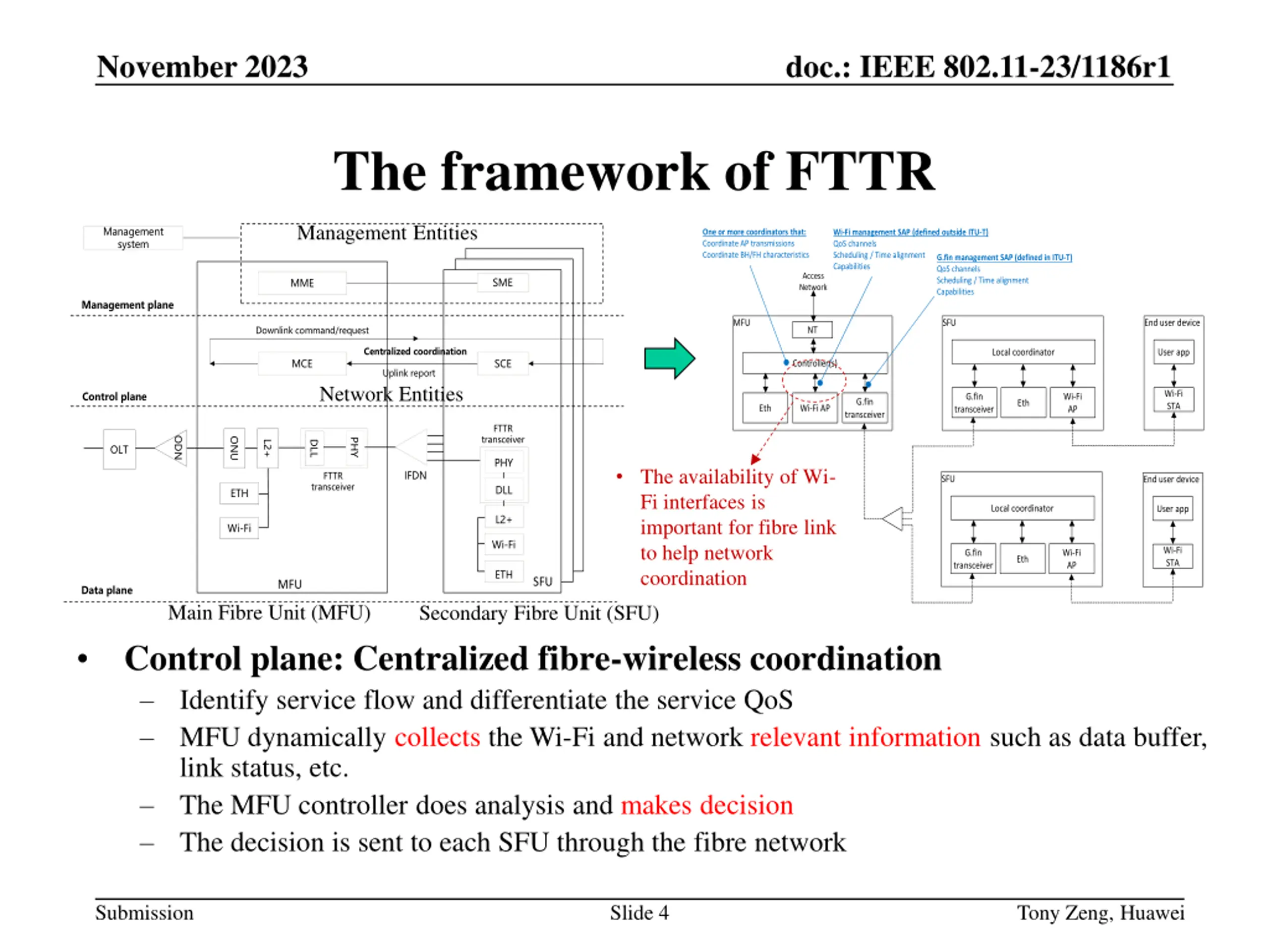 Explore how IEEE 802.11-23/1186r1 introduces Multi-AP coordination over fibre to improve Quality of Experience (QoE) in Wi-Fi deployment. The framework of Fibre-to-The-Room (FTTR) management entities, differences between FTTR and UHR coordination, and the business scenarios and benefits of FTTR are discussed. This innovative approach aims to address latency, connectivity, and scalability challenges in in-premises networks, supporting applications like XR, cloud gaming, and industrial use cases.