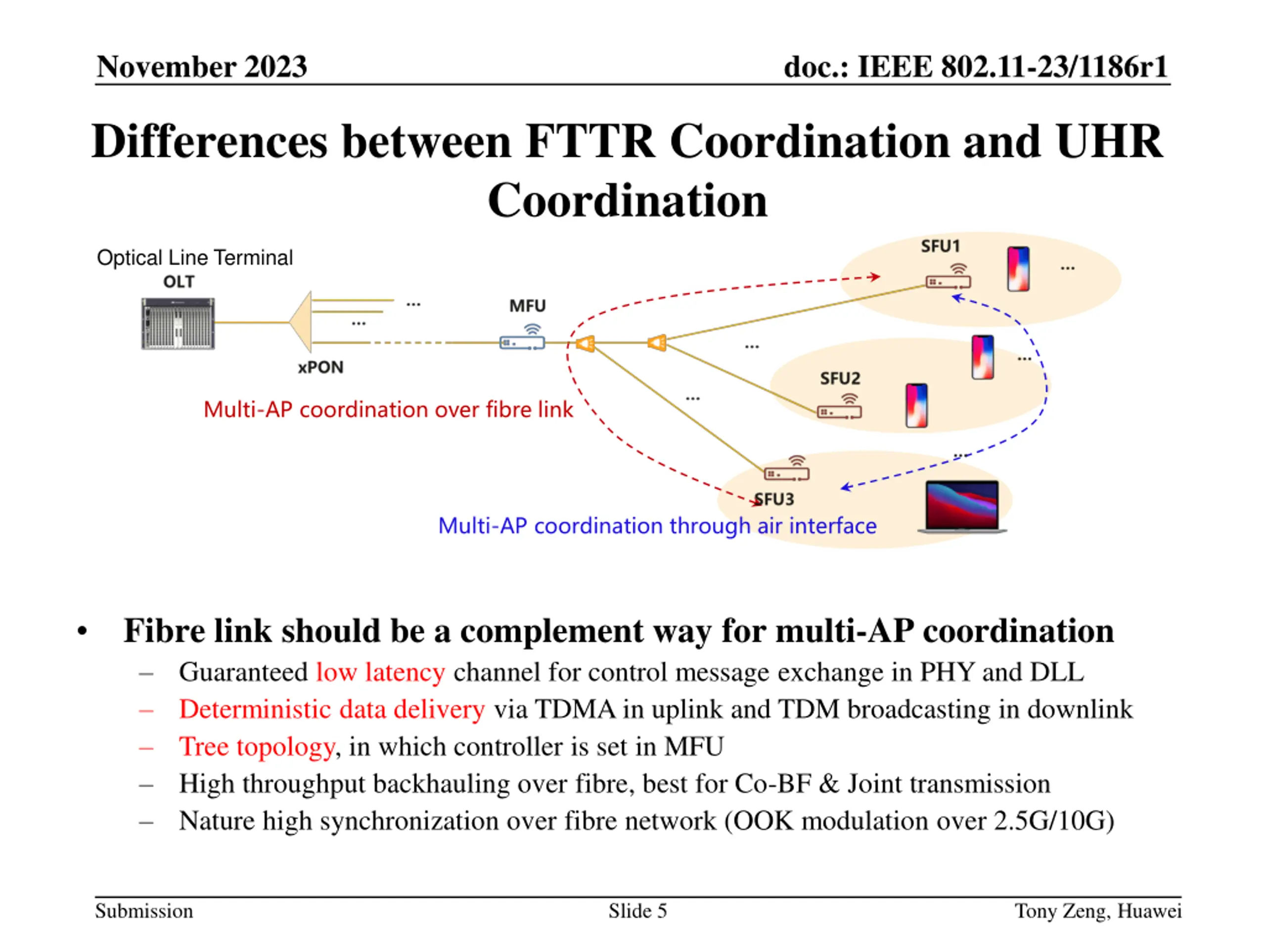 November 2023 doc.: IEEE 802.11-23/1186r1 The framework of FTTR Management Entities Management system One or more coordinators that: Coordinate AP transmissions Coordinate BH/FH characteristics Wi-Fi management SAP (defined outside ITU-T) QoS channels Scheduling / Time alignment Capabilities G.fin management SAP (defined in ITU-T) QoS channels Scheduling / Time alignment Capabilities Access Network SME MME Management plane MFU SFU End user device Downlink command/request NT Centralized coordination Local coordinator User app MCE SCE Controller(s) Uplink report Network Entities Wi-Fi STA Control plane G.fin Wi-Fi AP G.fin Eth Eth Wi-Fi AP transceiver transceiver FTTR transceiver ODN ONU PHY L2+ DLL OLT PHY The availability of Wi- Fi interfaces is important for fibre link to help network coordination IFDN FTTR SFU End user device transceiver DLL ETH Local coordinator User app L2+ Wi-Fi Wi-Fi Wi-Fi STA G.fin Wi-Fi AP Eth transceiver ETH SFU MFU Data plane Main Fibre Unit (MFU) Secondary Fibre Unit (SFU) Control plane: Centralized fibre-wireless coordination Identify service flow and differentiate the service QoS MFU dynamically collects the Wi-Fi and network relevant information such as data buffer, link status, etc. The MFU controller does analysis and makes decision The decision is sent to each SFU through the fibre network Submission Slide 4 Tony Zeng, Huawei