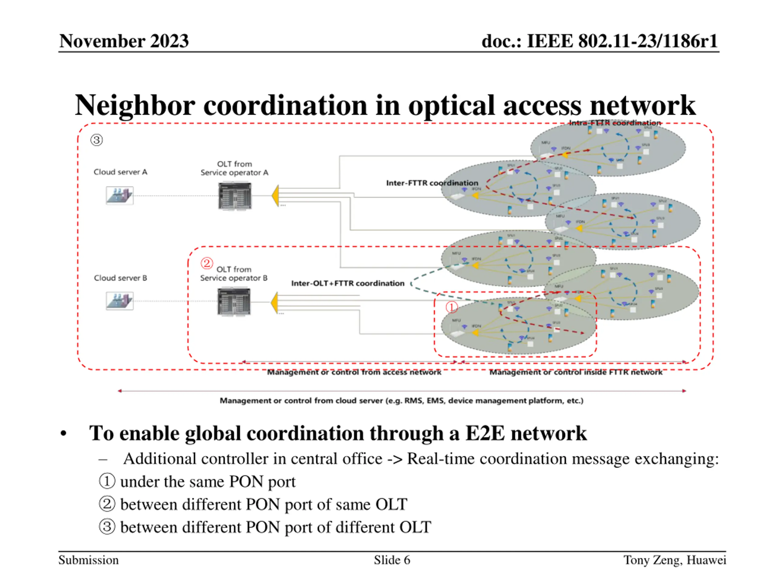 November 2023 doc.: IEEE 802.11-23/1186r1 Neighbor coordination in optical access network To enable global coordination through a E2E network Additional controller in central office -> Real-time coordination message exchanging: under the same PON port between different PON port of same OLT between different PON port of different OLT Submission Slide 6 Tony Zeng, Huawei