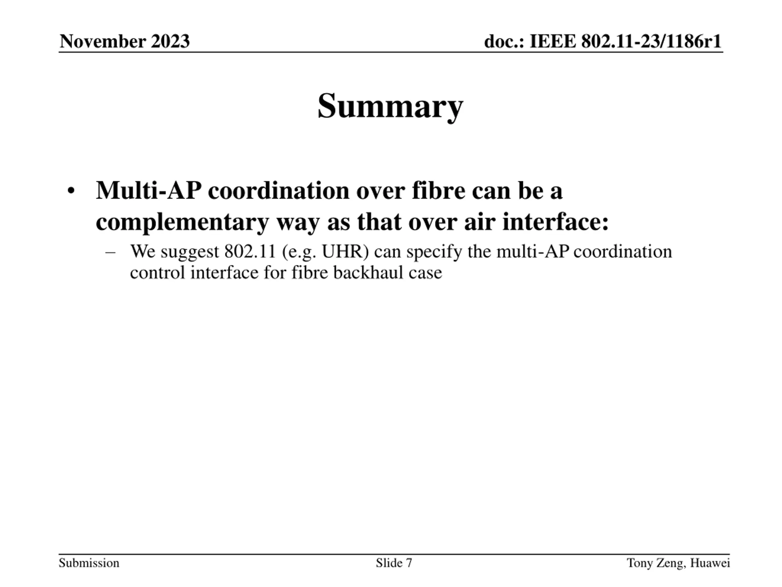 November 2023 doc.: IEEE 802.11-23/1186r1 Summary Multi-AP coordination over fibre can be a complementary way as that over air interface: We suggest 802.11 (e.g. UHR) can specify the multi-AP coordination control interface for fibre backhaul case Submission Slide 7 Tony Zeng, Huawei