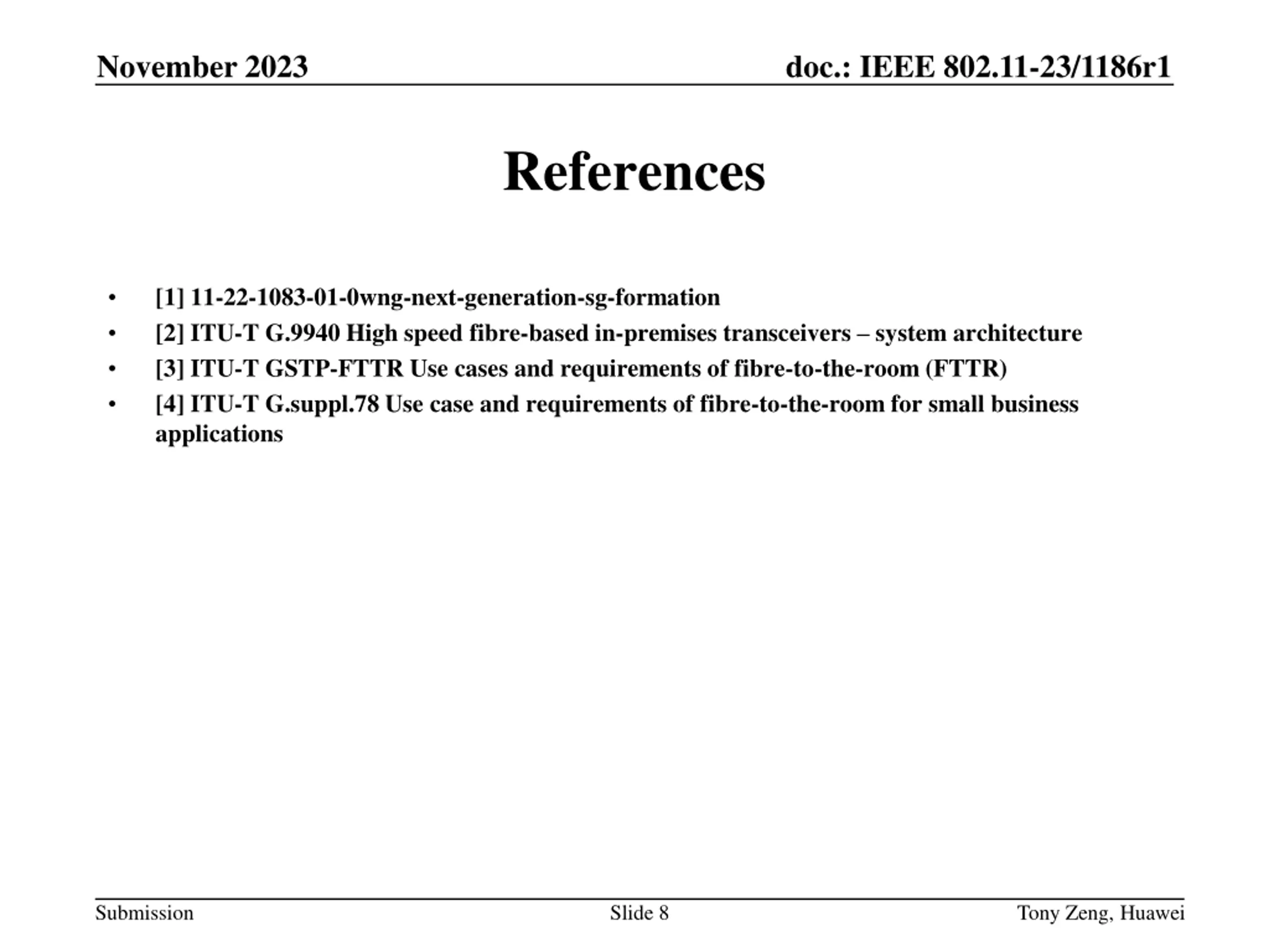 November 2023 doc.: IEEE 802.11-23/1186r1 References [1] 11-22-1083-01-0wng-next-generation-sg-formation [2] ITU-T G.9940 High speed fibre-based in-premises transceivers system architecture [3] ITU-T GSTP-FTTR Use cases and requirements of fibre-to-the-room (FTTR) [4] ITU-T G.suppl.78 Use case and requirements of fibre-to-the-room for small business applications Submission Slide 8 Tony Zeng, Huawei