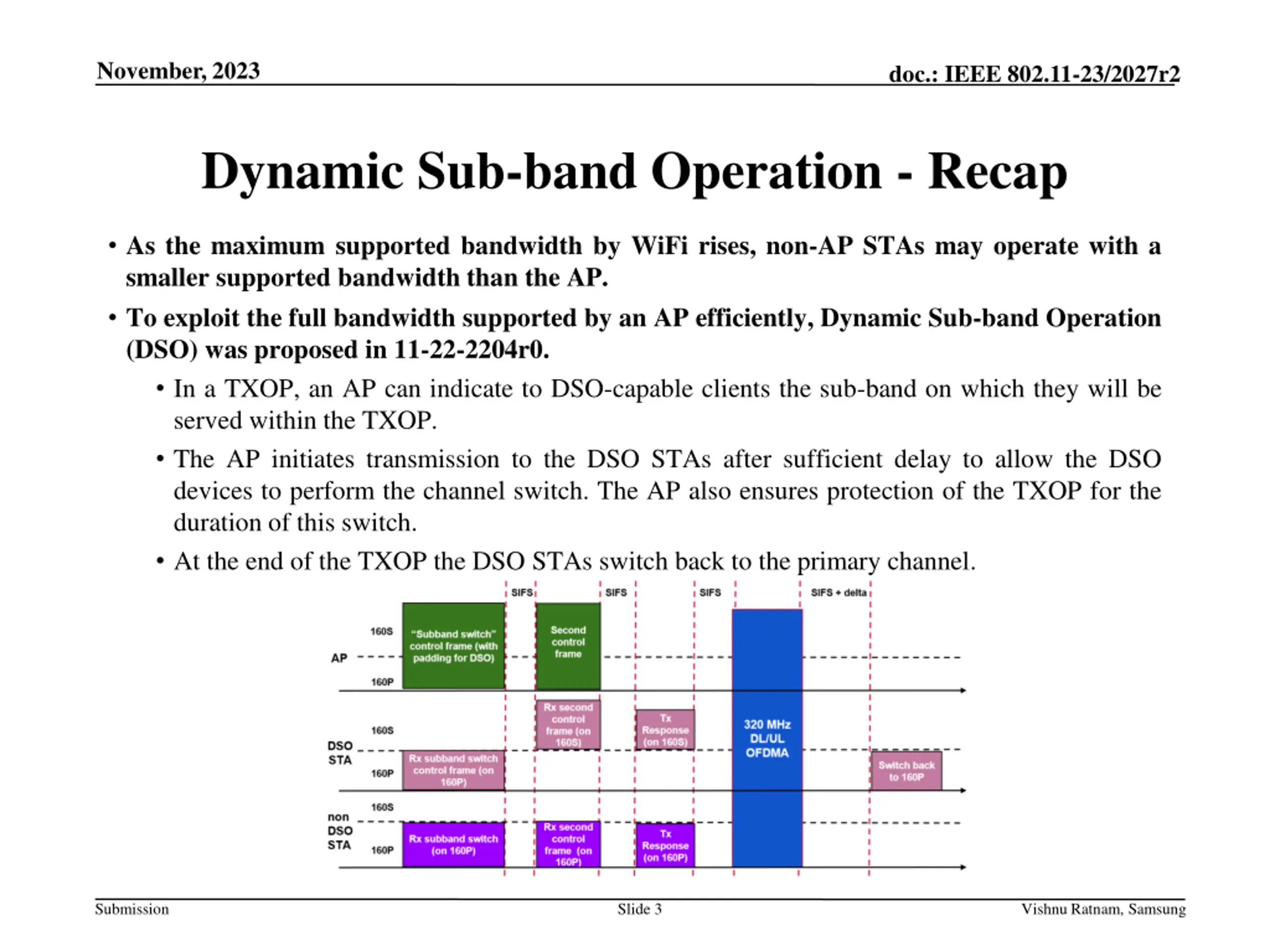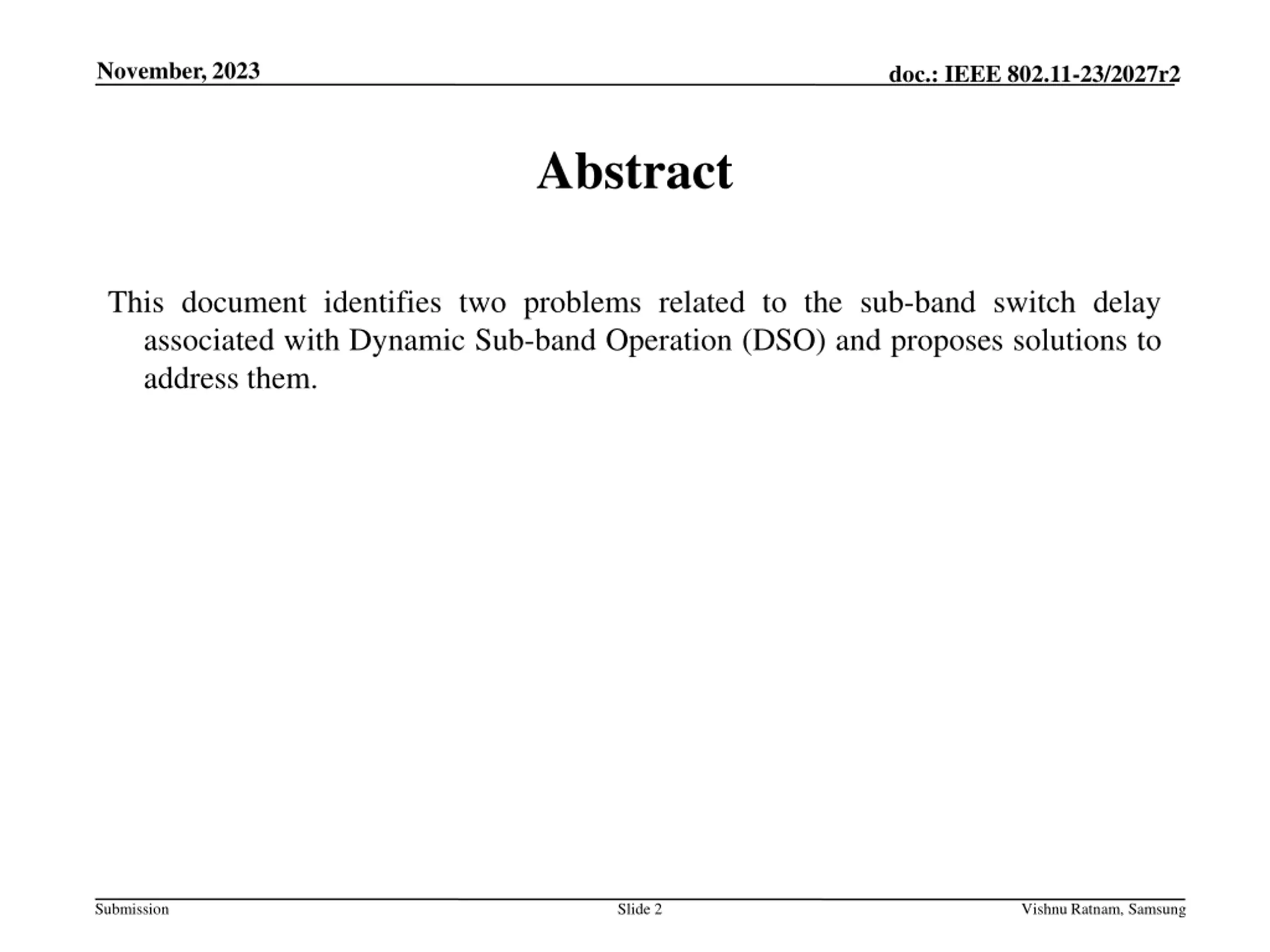 November, 2023 doc.: IEEE 802.11-23/2027r2 Abstract This document identifies two problems related to the sub-band switch delay associated with Dynamic Sub-band Operation (DSO) and proposes solutions to address them. Submission Slide 2 Vishnu Ratnam, Samsung
