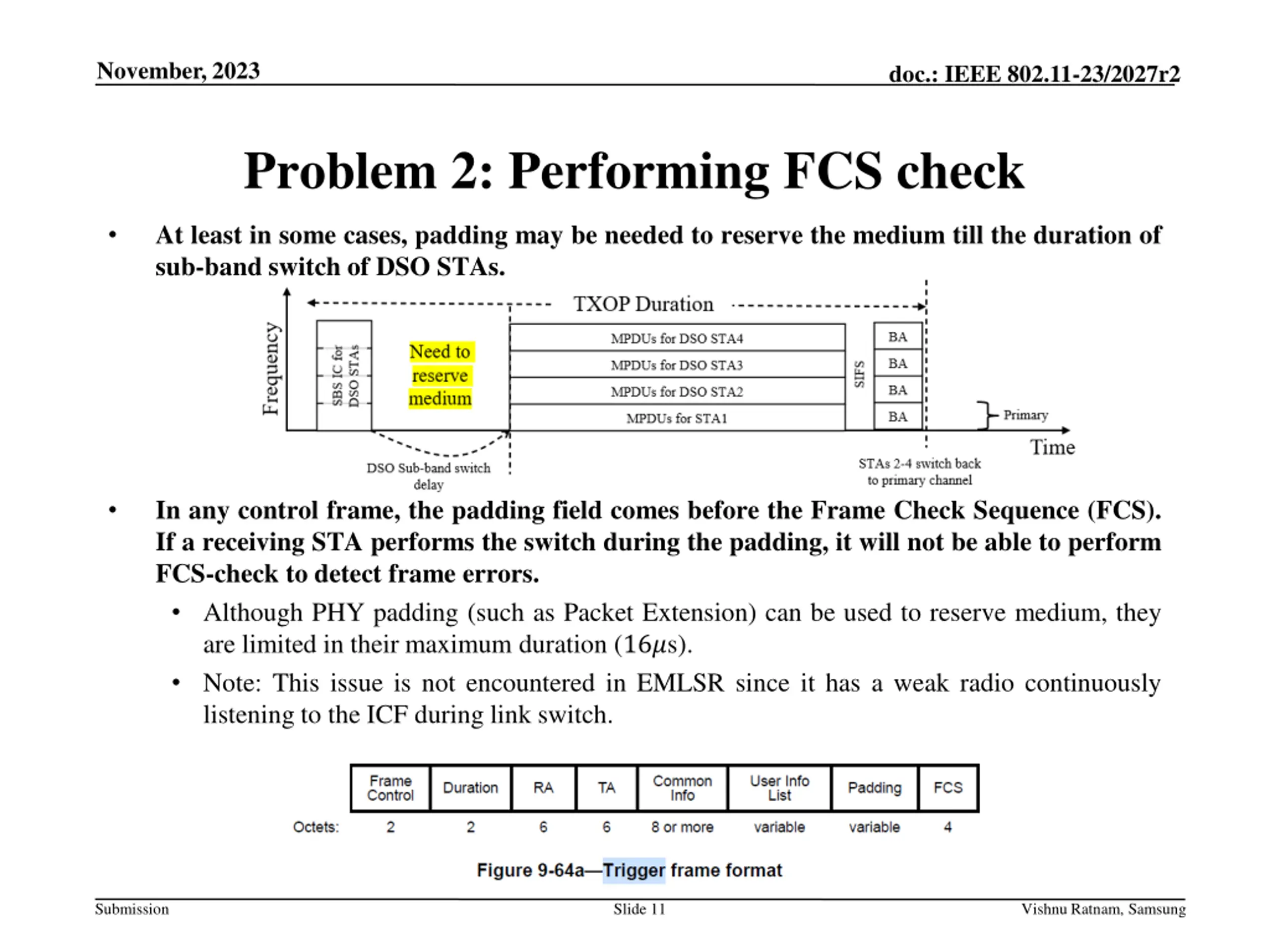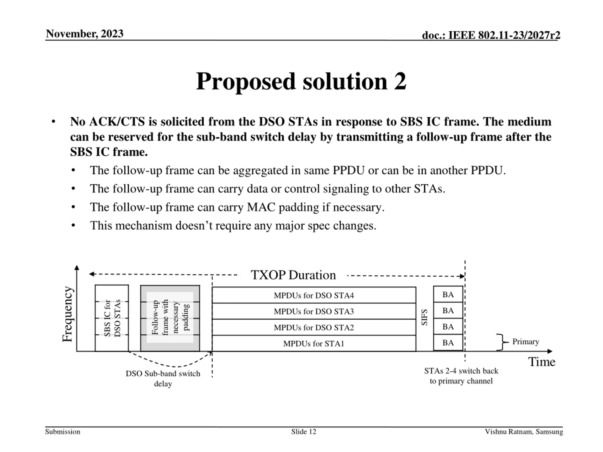 November, 2023 doc.: IEEE 802.11-23/2027r2 Problem 2: Performing FCS check At least in some cases, padding may be needed to reserve the medium till the duration of sub-band switch of DSO STAs. In any control frame, the padding field comes before the Frame Check Sequence (FCS). If a receiving STA performs the switch during the padding, it will not be able to perform FCS-check to detect frame errors. Although PHY padding (such as Packet Extension) can be used to reserve medium, they are limited in their maximum duration (16?s). Note: This issue is not encountered in EMLSR since it has a weak radio continuously listening to the ICF during link switch. Submission Slide 11 Vishnu Ratnam, Samsung