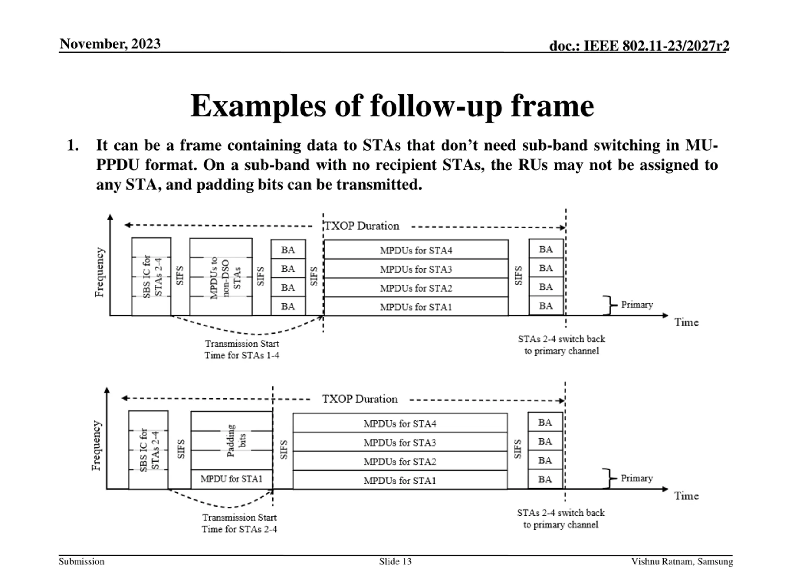 November, 2023 doc.: IEEE 802.11-23/2027r2 Examples of follow-up frame 1. It can be a frame containing data to STAs that don t need sub-band switching in MU- PPDU format. On a sub-band with no recipient STAs, the RUs may not be assigned to any STA, and padding bits can be transmitted. Submission Slide 13 Vishnu Ratnam, Samsung