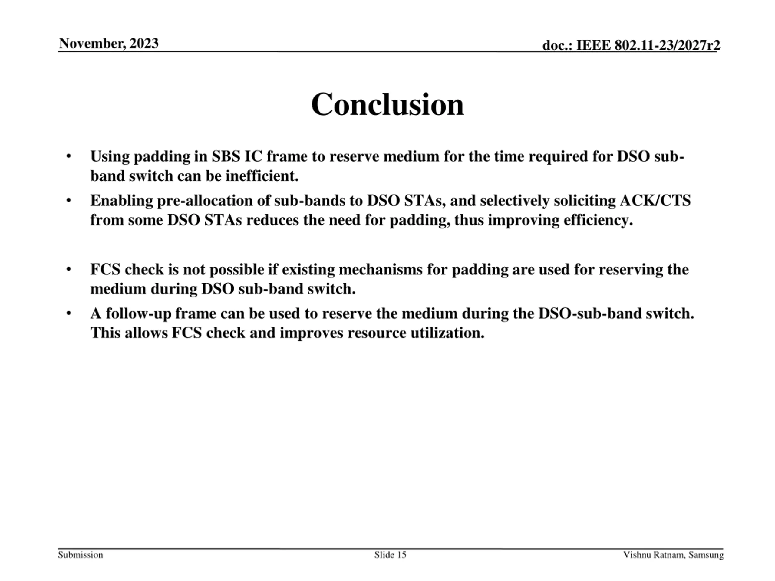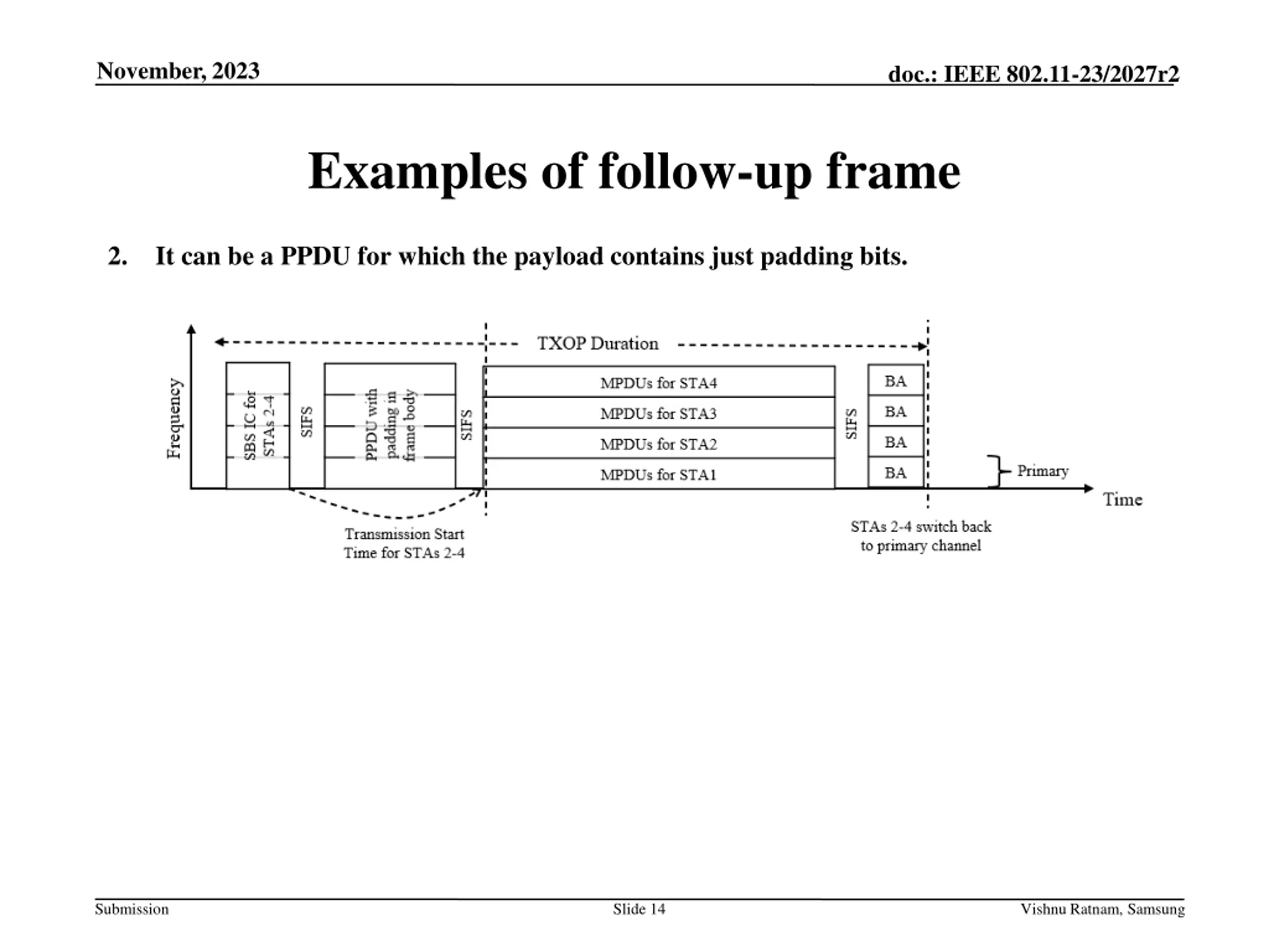 November, 2023 doc.: IEEE 802.11-23/2027r2 Examples of follow-up frame 2. It can be a PPDU for which the payload contains just padding bits. Submission Slide 14 Vishnu Ratnam, Samsung