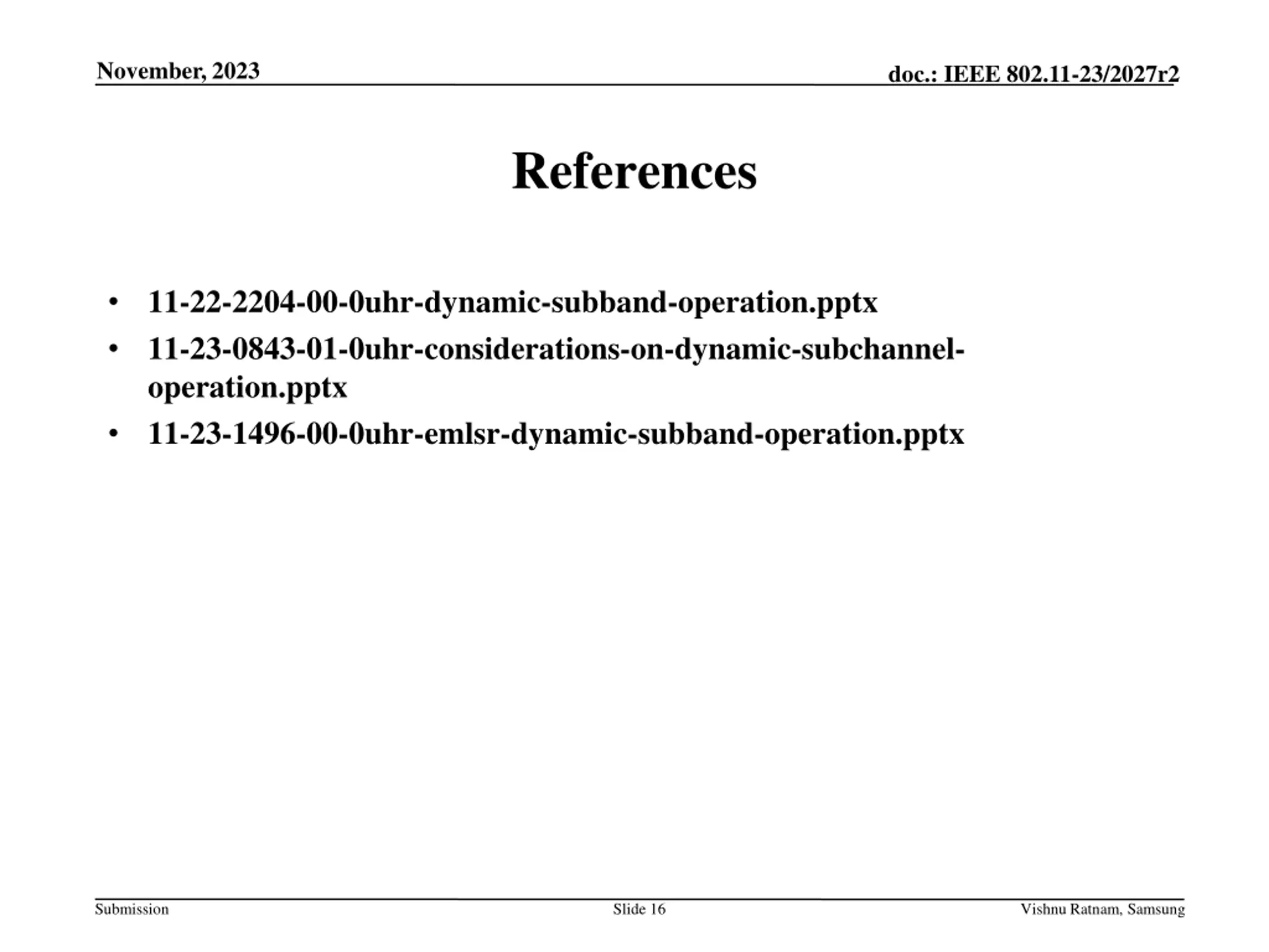 November, 2023 doc.: IEEE 802.11-23/2027r2 References 11-22-2204-00-0uhr-dynamic-subband-operation.pptx 11-23-0843-01-0uhr-considerations-on-dynamic-subchannel- operation.pptx 11-23-1496-00-0uhr-emlsr-dynamic-subband-operation.pptx Submission Slide 16 Vishnu Ratnam, Samsung