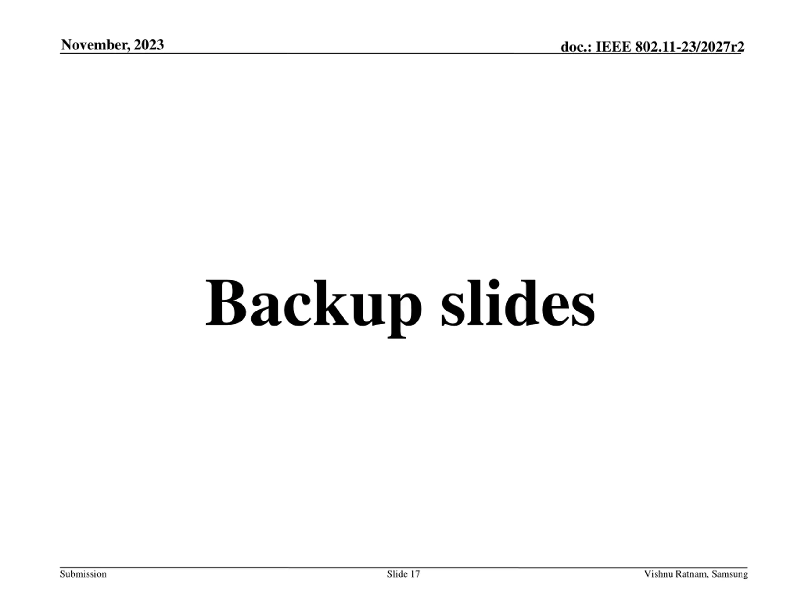 November, 2023 doc.: IEEE 802.11-23/2027r2 Backup slides Submission Slide 17 Vishnu Ratnam, Samsung