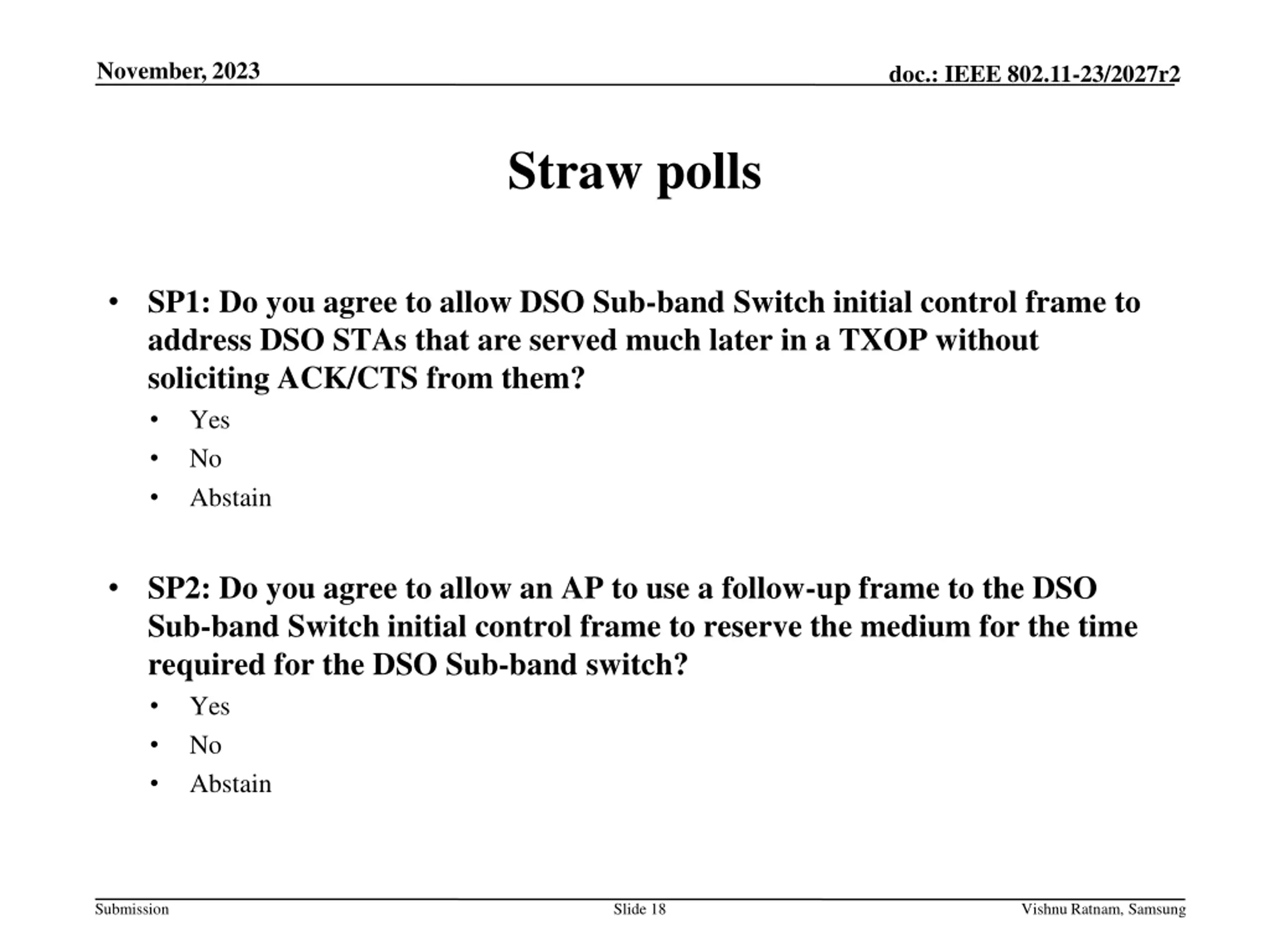 November, 2023 doc.: IEEE 802.11-23/2027r2 Straw polls SP1: Do you agree to allow DSO Sub-band Switch initial control frame to address DSO STAs that are served much later in a TXOP without soliciting ACK/CTS from them? Yes No Abstain SP2: Do you agree to allow an AP to use a follow-up frame to the DSO Sub-band Switch initial control frame to reserve the medium for the time required for the DSO Sub-band switch? Yes No Abstain Submission Slide 18 Vishnu Ratnam, Samsung