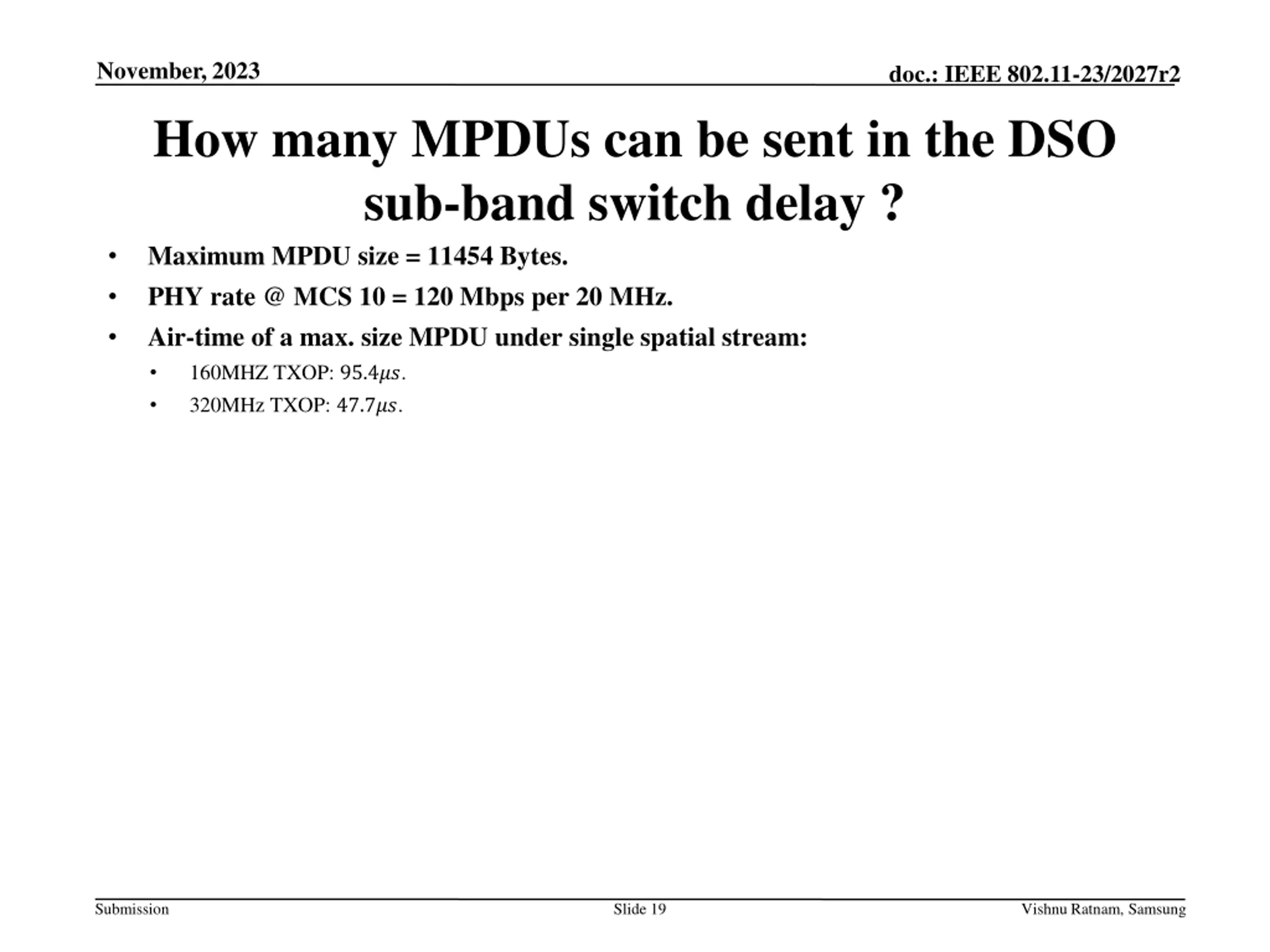 November, 2023 doc.: IEEE 802.11-23/2027r2 How many MPDUs can be sent in the DSO sub-band switch delay ? Maximum MPDU size = 11454 Bytes. PHY rate @ MCS 10 = 120 Mbps per 20 MHz. Air-time of a max. size MPDU under single spatial stream: 160MHZ TXOP: 95.4??. 320MHz TXOP: 47.7??. Submission Slide 19 Vishnu Ratnam, Samsung