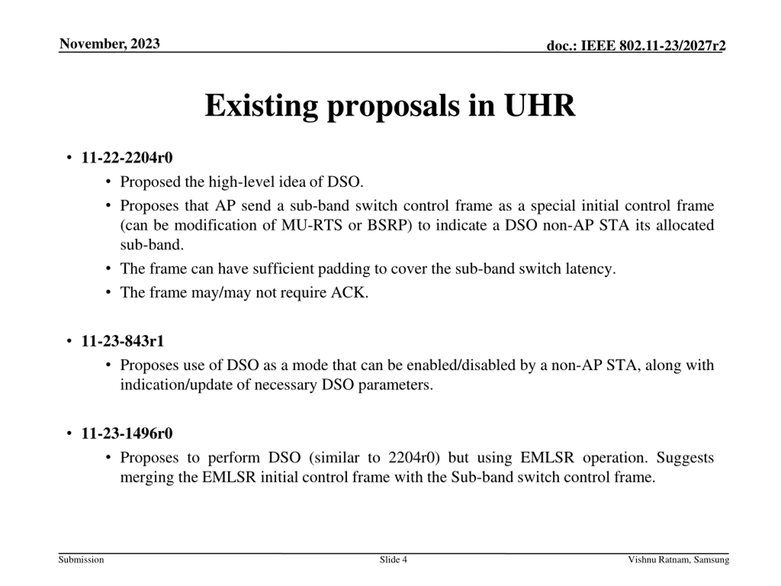 November, 2023 doc.: IEEE 802.11-23/2027r2 Considerations for DSO Sub-band switch delay Date: 2023-11-10 Authors: Name Vishnu V. Ratnam Affiliations Samsung Research America Address Phone email vishnu.r@samsung.com Boon L. Ng Rubayet Shafin Peshal Nayak Yue Qi Submission Slide 1 Vishnu Ratnam, Samsung
