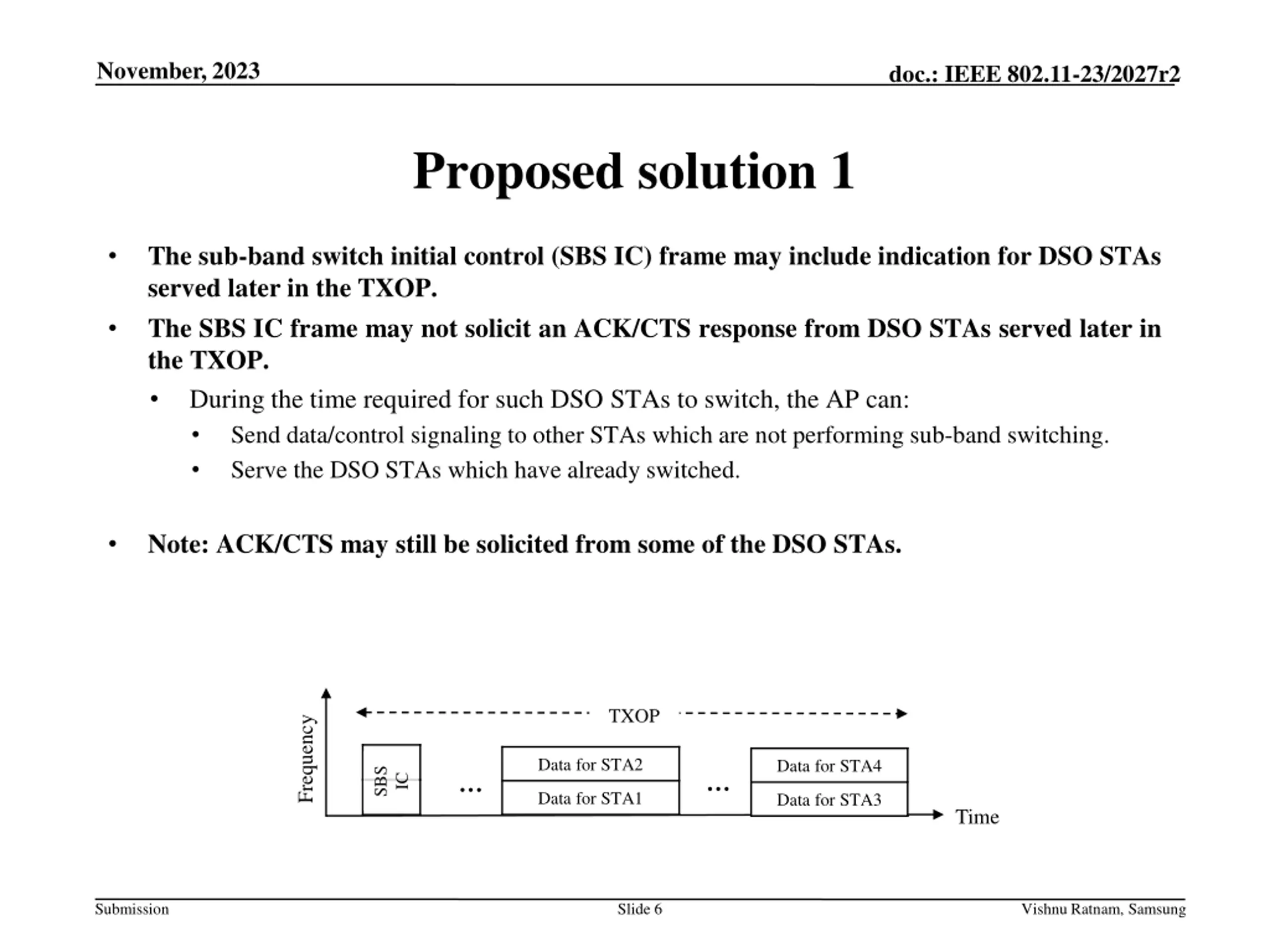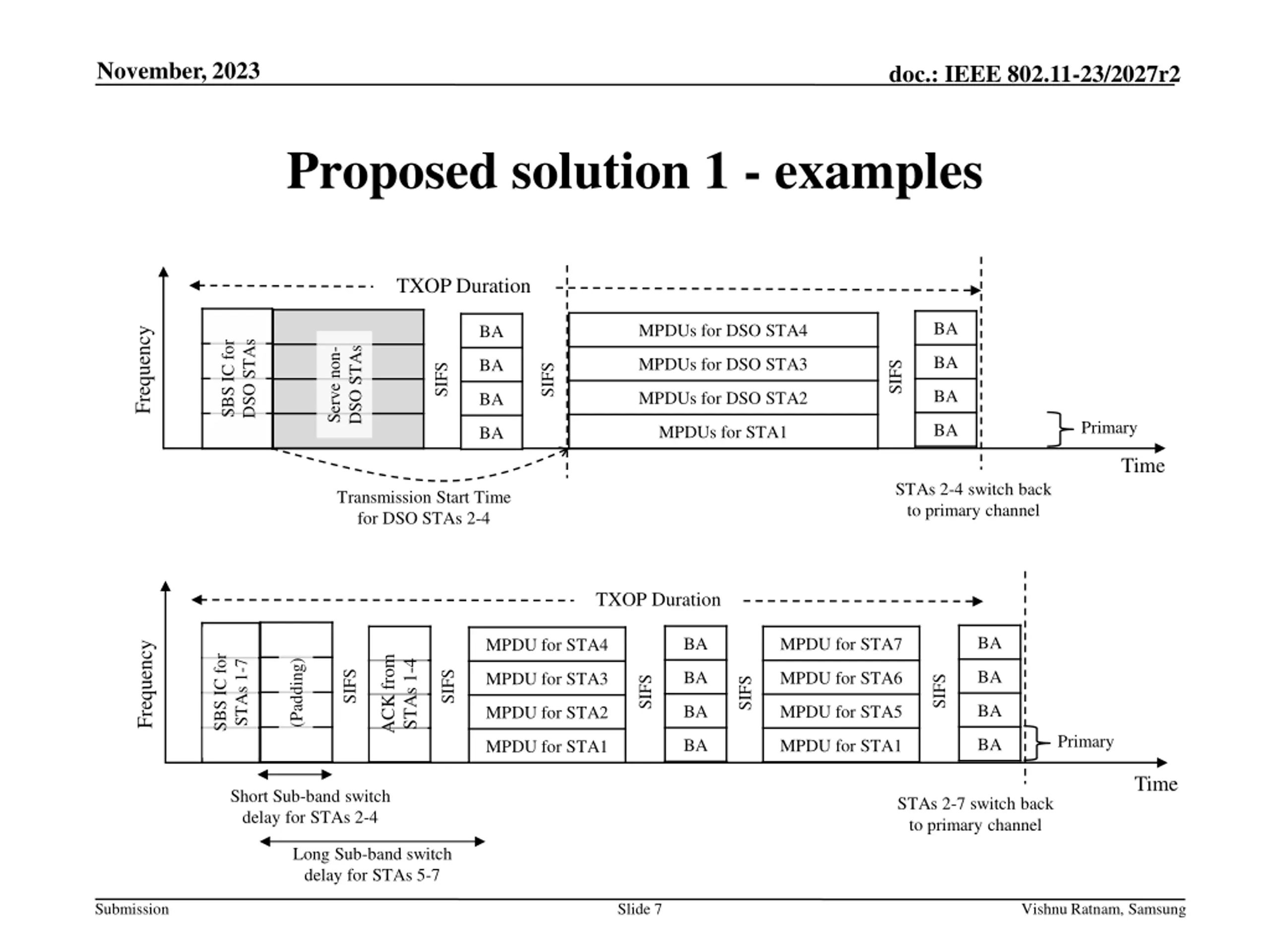 November, 2023 doc.: IEEE 802.11-23/2027r2 Proposed solution 1 The sub-band switch initial control (SBS IC) frame may include indication for DSO STAs served later in the TXOP. The SBS IC frame may not solicit an ACK/CTS response from DSO STAs served later in the TXOP. During the time required for such DSO STAs to switch, the AP can: Send data/control signaling to other STAs which are not performing sub-band switching. Serve the DSO STAs which have already switched. Note: ACK/CTS may still be solicited from some of the DSO STAs. TXOP Frequency Data for STA2 Data for STA4 SBS IC Data for STA1 Data for STA3 Time Submission Slide 6 Vishnu Ratnam, Samsung