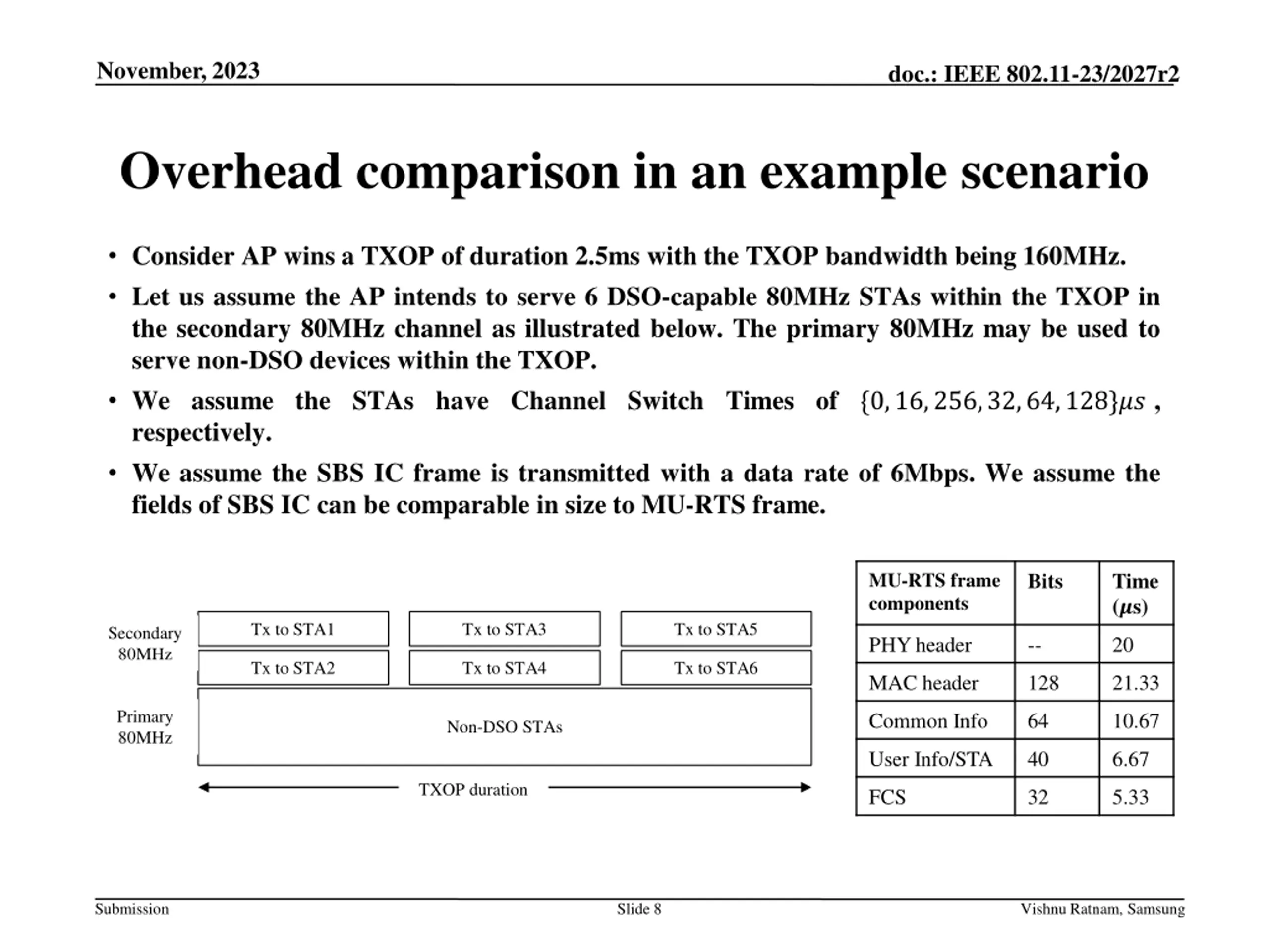 November, 2023 doc.: IEEE 802.11-23/2027r2 Overhead comparison in an example scenario Consider AP wins a TXOP of duration 2.5ms with the TXOP bandwidth being 160MHz. Let us assume the AP intends to serve 6 DSO-capable 80MHz STAs within the TXOP in the secondary 80MHz channel as illustrated below. The primary 80MHz may be used to serve non-DSO devices within the TXOP. We assume the STAs have Channel Switch Times of {0,16,256,32,64,128}?? , respectively. We assume the SBS IC frame is transmitted with a data rate of 6Mbps. We assume the fields of SBS IC can be comparable in size to MU-RTS frame. MU-RTS frame components Bits Time (?s) Tx to STA1 Tx to STA3 Tx to STA5 Secondary 80MHz PHY header -- 20 Tx to STA2 Tx to STA4 Tx to STA6 MAC header 128 21.33 Primary 80MHz Common Info 64 10.67 Non-DSO STAs User Info/STA 40 6.67 TXOP duration FCS 32 5.33 Submission Slide 8 Vishnu Ratnam, Samsung