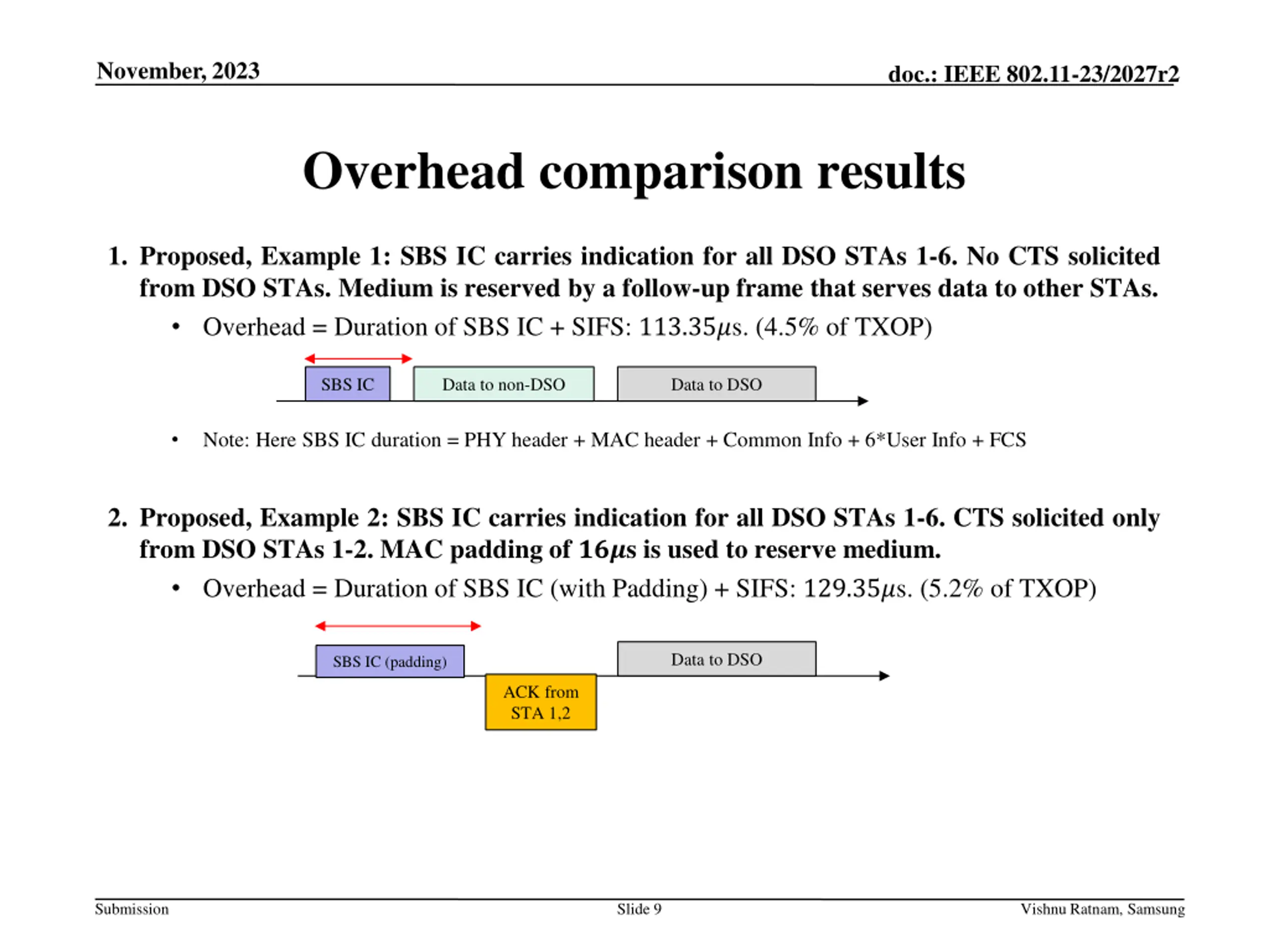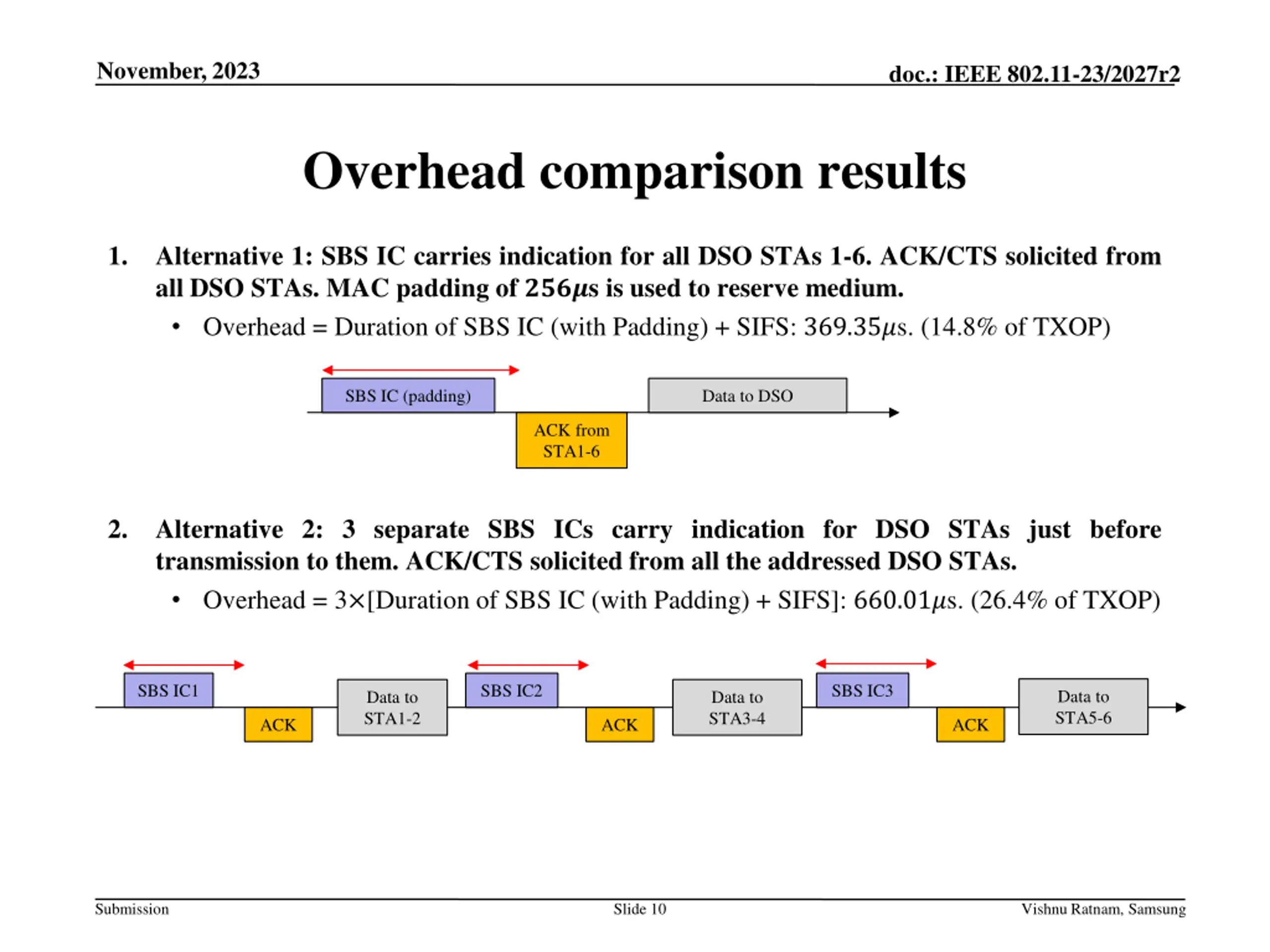 November, 2023 doc.: IEEE 802.11-23/2027r2 Overhead comparison results 1. Alternative 1: SBS IC carries indication for all DSO STAs 1-6. ACK/CTS solicited from all DSO STAs. MAC padding of ????s is used to reserve medium. Overhead = Duration of SBS IC (with Padding) + SIFS: 369.35?s. (14.8% of TXOP) SBS IC (padding) Data to DSO ACK from STA1-6 2. Alternative 2: 3 separate SBS ICs carry indication for DSO STAs just before transmission to them. ACK/CTS solicited from all the addressed DSO STAs. Overhead = 3 [Duration of SBS IC (with Padding) + SIFS]: 660.01?s. (26.4% of TXOP) SBS IC1 SBS IC2 SBS IC3 Data to STA5-6 Data to STA1-2 Data to STA3-4 ACK ACK ACK Submission Slide 10 Vishnu Ratnam, Samsung