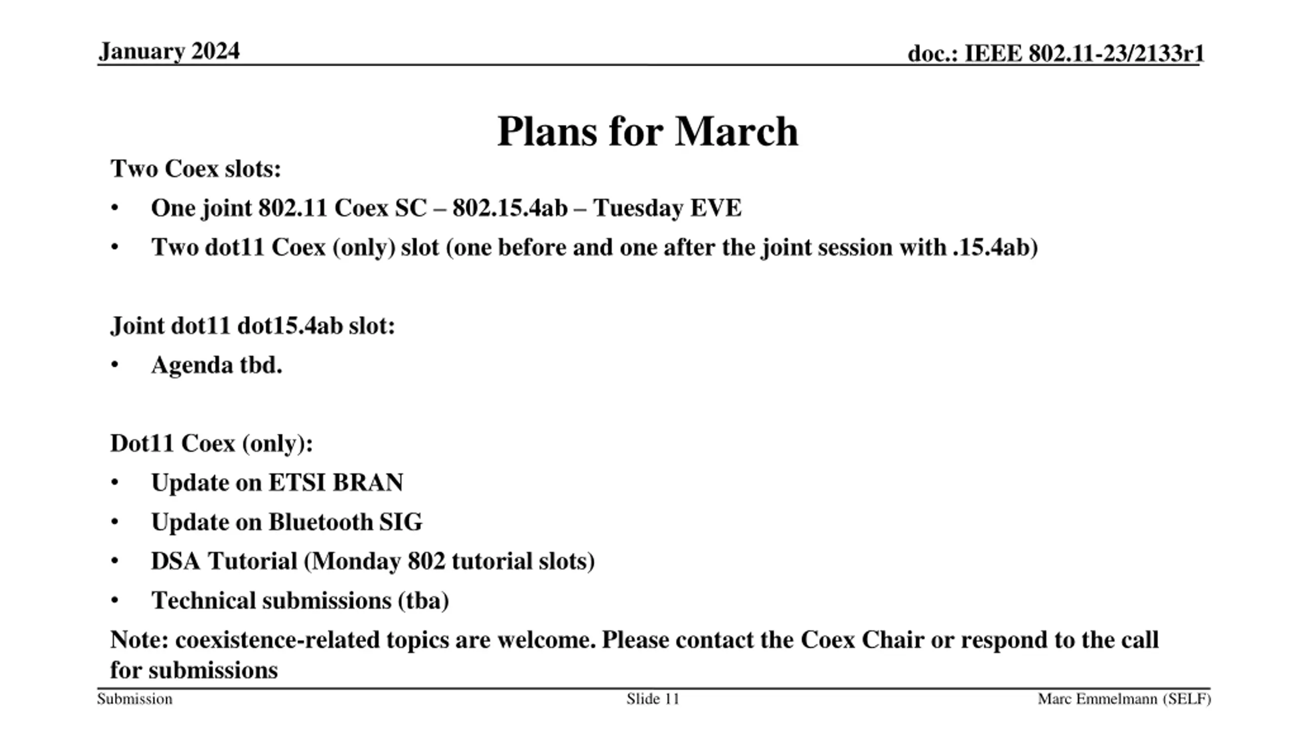 January 2024 doc.: IEEE 802.11-23/2133r1 Plans for March Two Coex slots: One joint 802.11 Coex SC 802.15.4ab Tuesday EVE Two dot11 Coex (only) slot (one before and one after the joint session with .15.4ab) Joint dot11 dot15.4ab slot: Agenda tbd. Dot11 Coex (only): Update on ETSI BRAN Update on Bluetooth SIG DSA Tutorial (Monday 802 tutorial slots) Technical submissions (tba) Note: coexistence-related topics are welcome. Please contact the Coex Chair or respond to the call for submissions Slide 11 Submission Marc Emmelmann (SELF)