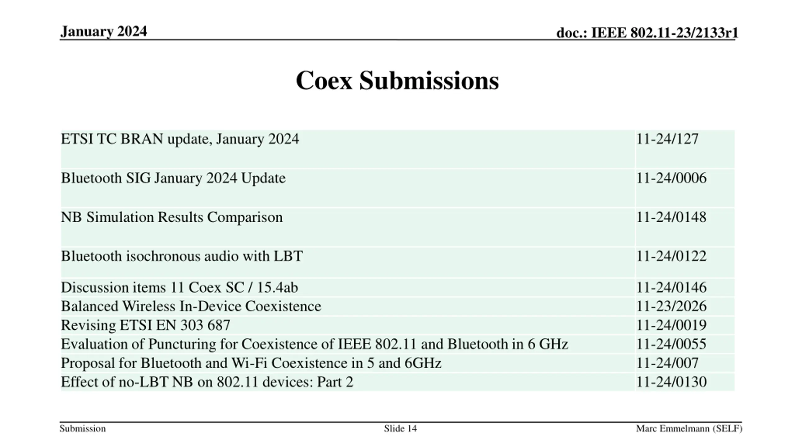 January 2024 doc.: IEEE 802.11-23/2133r1 Coex Submissions ETSI TC BRAN update, January 2024 11-24/127 Bluetooth SIG January 2024 Update 11-24/0006 NB Simulation Results Comparison 11-24/0148 Bluetooth isochronous audio with LBT 11-24/0122 Discussion items 11 Coex SC / 15.4ab Balanced Wireless In-Device Coexistence Revising ETSI EN 303 687 Evaluation of Puncturing for Coexistence of IEEE 802.11 and Bluetooth in 6 GHz Proposal for Bluetooth and Wi-Fi Coexistence in 5 and 6GHz Effect of no-LBT NB on 802.11 devices: Part 2 11-24/0146 11-23/2026 11-24/0019 11-24/0055 11-24/007 11-24/0130 Submission Slide 14 Marc Emmelmann (SELF)