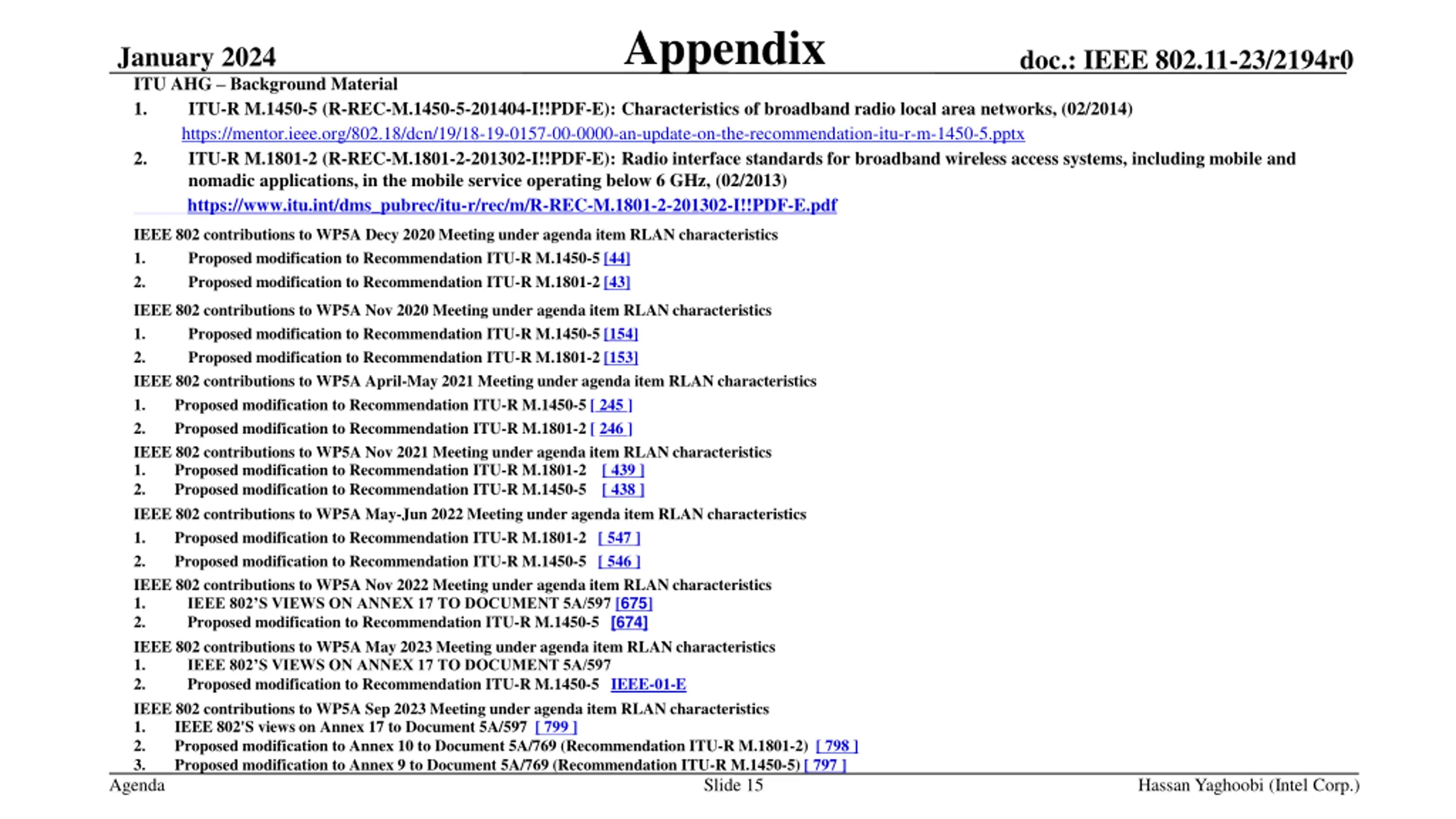 Appendix January 2024 doc.: IEEE 802.11-23/2194r0 ITU AHG Background Material 1. ITU-R M.1450-5 (R-REC-M.1450-5-201404-I!!PDF-E): Characteristics of broadband radio local area networks, (02/2014) https://mentor.ieee.org/802.18/dcn/19/18-19-0157-00-0000-an-update-on-the-recommendation-itu-r-m-1450-5.pptx 2. ITU-R M.1801-2 (R-REC-M.1801-2-201302-I!!PDF-E): Radio interface standards for broadband wireless access systems, including mobile and nomadic applications, in the mobile service operating below 6 GHz, (02/2013) https://www.itu.int/dms_pubrec/itu-r/rec/m/R-REC-M.1801-2-201302-I!!PDF-E.pdf IEEE 802 contributions to WP5A Decy 2020 Meeting under agenda item RLAN characteristics 1. Proposed modification to Recommendation ITU-R M.1450-5 [44] 2. Proposed modification to Recommendation ITU-R M.1801-2 [43] IEEE 802 contributions to WP5A Nov 2020 Meeting under agenda item RLAN characteristics 1. Proposed modification to Recommendation ITU-R M.1450-5 [154] 2. Proposed modification to Recommendation ITU-R M.1801-2 [153] IEEE 802 contributions to WP5A April-May 2021 Meeting under agenda item RLAN characteristics 1. Proposed modification to Recommendation ITU-R M.1450-5 [ 245 ] 2. Proposed modification to Recommendation ITU-R M.1801-2 [ 246 ] IEEE 802 contributions to WP5A Nov 2021 Meeting under agenda item RLAN characteristics 1. Proposed modification to Recommendation ITU-R M.1801-2 [ 439 ] 2. Proposed modification to Recommendation ITU-R M.1450-5 [ 438 ] IEEE 802 contributions to WP5A May-Jun 2022 Meeting under agenda item RLAN characteristics 1. Proposed modification to Recommendation ITU-R M.1801-2 [ 547 ] 2. Proposed modification to Recommendation ITU-R M.1450-5 [ 546 ] IEEE 802 contributions to WP5A Nov 2022 Meeting under agenda item RLAN characteristics 1. IEEE 802 S VIEWS ON ANNEX 17 TO DOCUMENT 5A/597[675] 2. Proposed modification to Recommendation ITU-R M.1450-5 [674] IEEE 802 contributions to WP5A May 2023 Meeting under agenda item RLAN characteristics 1. IEEE 802 S VIEWS ON ANNEX 17 TO DOCUMENT 5A/597 2. Proposed modification to Recommendation ITU-R M.1450-5 IEEE-01-E IEEE 802 contributions to WP5A Sep 2023 Meeting under agenda item RLAN characteristics 1. IEEE 802'S views on Annex 17 to Document 5A/597 [ 799 ] 2. Proposed modification to Annex 10 to Document 5A/769 (Recommendation ITU-R M.1801-2) [ 798 ] 3. Proposed modification to Annex 9 to Document 5A/769 (Recommendation ITU-R M.1450-5) [ 797 ] Agenda Slide 15 Hassan Yaghoobi (Intel Corp.)