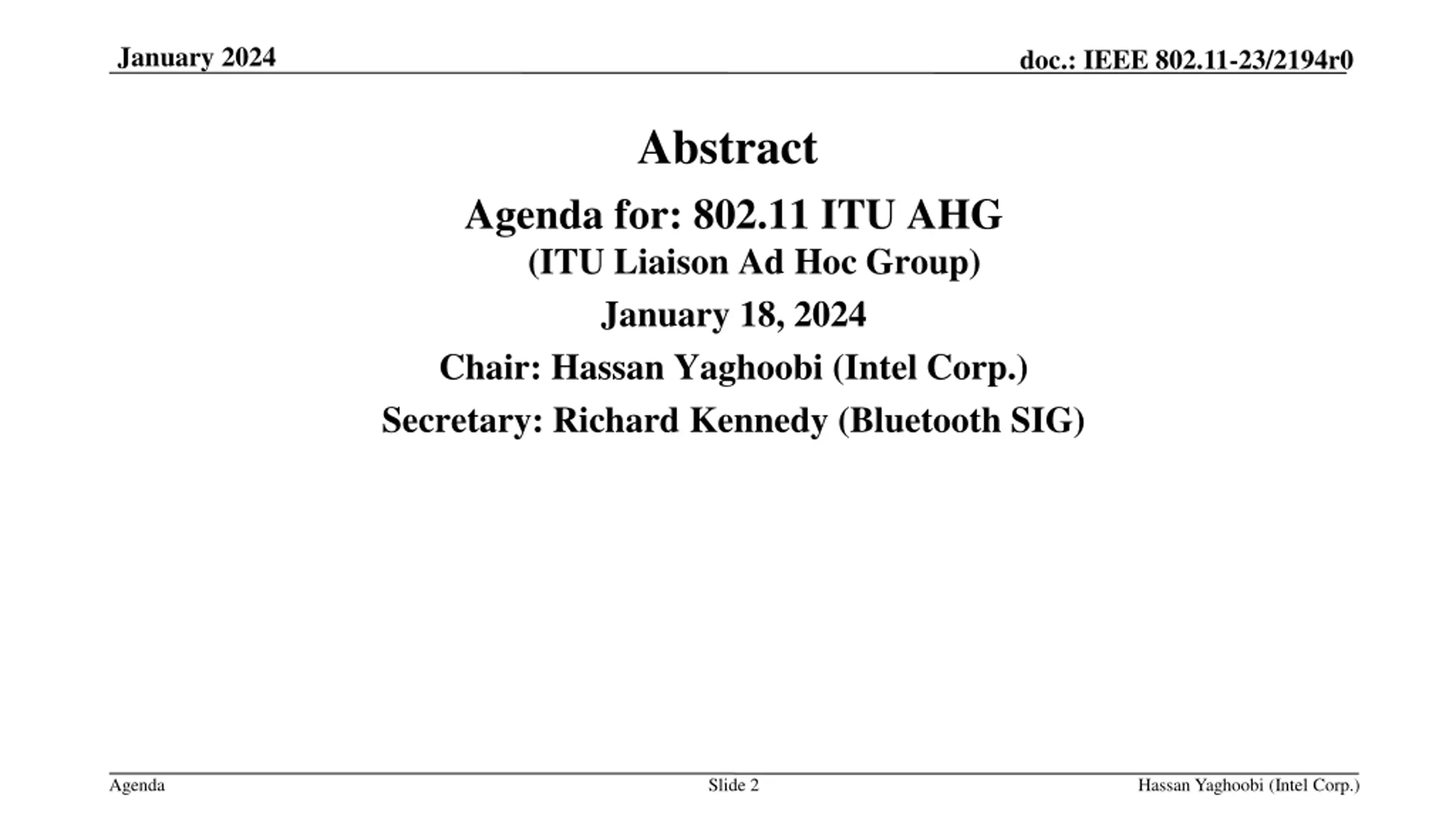 January 2024 doc.: IEEE 802.11-23/2194r0 Abstract Agenda for: 802.11 ITU AHG (ITU Liaison Ad Hoc Group) January 18, 2024 Chair: Hassan Yaghoobi (Intel Corp.) Secretary: Richard Kennedy (Bluetooth SIG) Agenda Slide 2 Hassan Yaghoobi (Intel Corp.)