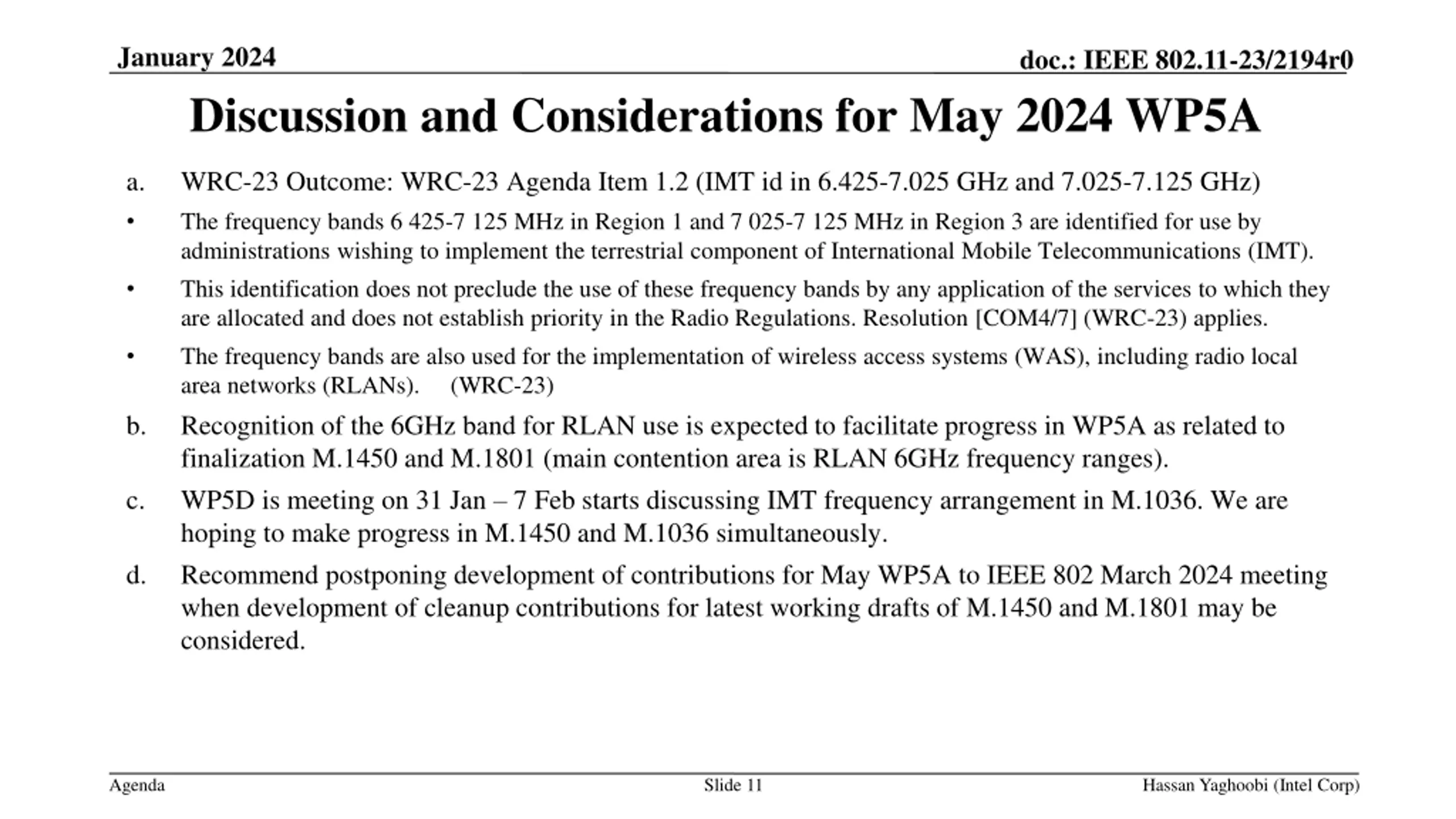 January 2024 doc.: IEEE 802.11-23/2194r0 Discussion and Considerations for May 2024 WP5A a. WRC-23 Outcome: WRC-23 Agenda Item 1.2 (IMT id in 6.425-7.025 GHz and 7.025-7.125 GHz) The frequency bands 6 425-7 125 MHz in Region 1 and 7 025-7 125 MHz in Region 3 are identified for use by administrations wishing to implement the terrestrial component of International Mobile Telecommunications (IMT). This identification does not preclude the use of these frequency bands by any application of the services to which they are allocated and does not establish priority in the Radio Regulations. Resolution [COM4/7] (WRC-23) applies. The frequency bands are also used for the implementation of wireless access systems (WAS), including radio local area networks (RLANs). (WRC-23) Recognition of the 6GHz band for RLAN use is expected to facilitate progress in WP5A as related to finalization M.1450 and M.1801 (main contention area is RLAN 6GHz frequency ranges). WP5D is meeting on 31 Jan 7 Feb starts discussing IMT frequency arrangement in M.1036. We are hoping to make progress in M.1450 and M.1036 simultaneously. Recommend postponing development of contributions for May WP5A to IEEE 802 March 2024 meeting when development of cleanup contributions for latest working drafts of M.1450 and M.1801 may be considered. b. c. d. Agenda Slide 11 Hassan Yaghoobi (Intel Corp)