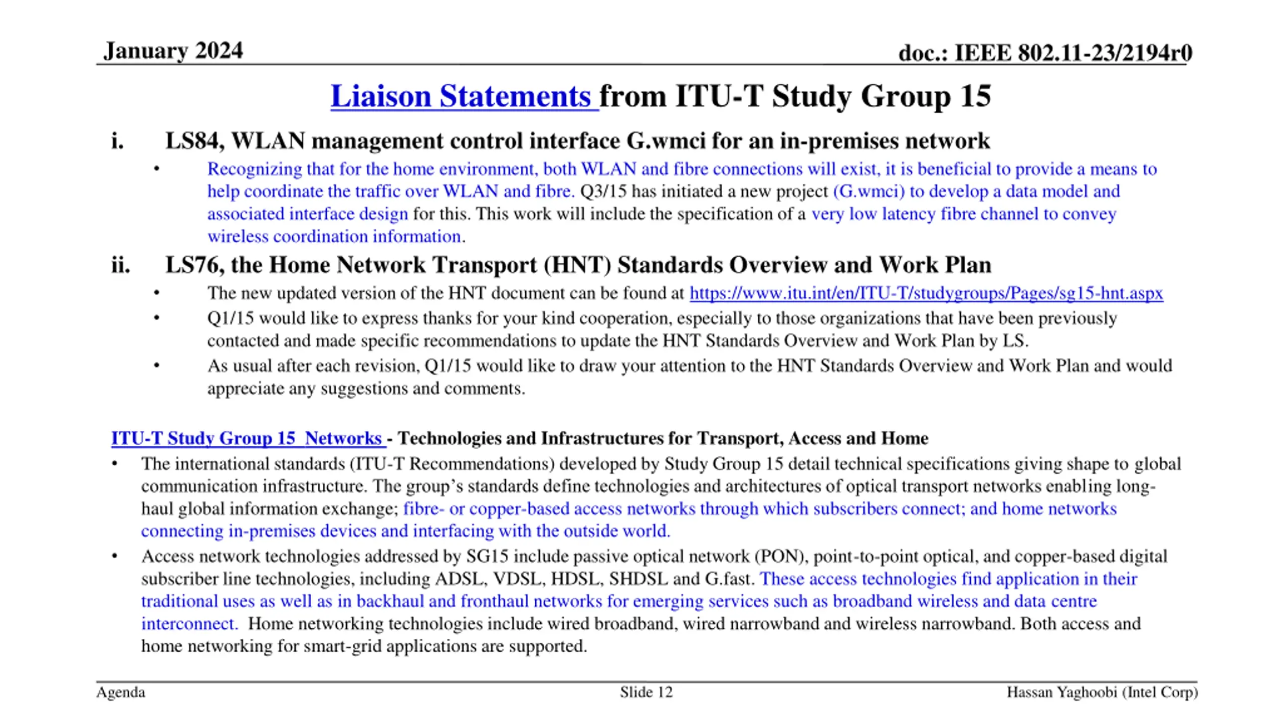 January 2024 doc.: IEEE 802.11-23/2194r0 Liaison Statements from ITU-T Study Group 15 i. LS84, WLAN management control interface G.wmci for an in-premises network Recognizing that for the home environment, both WLAN and fibre connections will exist, it is beneficial to provide a means to help coordinate the traffic over WLAN and fibre. Q3/15 has initiated a new project (G.wmci) to develop a data model and associated interface design for this. This work will include the specification of a very low latency fibre channel to convey wireless coordination information. LS76, the Home Network Transport (HNT) Standards Overview and Work Plan The new updated version of the HNT document can be found at https://www.itu.int/en/ITU-T/studygroups/Pages/sg15-hnt.aspx Q1/15 would like to express thanks for your kind cooperation, especially to those organizations that have been previously contacted and made specific recommendations to update the HNT Standards Overview and Work Plan by LS. As usual after each revision, Q1/15 would like to draw your attention to the HNT Standards Overview and Work Plan and would appreciate any suggestions and comments. ii. ITU-T Study Group 15 Networks - Technologies and Infrastructures for Transport, Access and Home The international standards (ITU-T Recommendations) developed by Study Group 15 detail technical specifications giving shape to global communication infrastructure. The group s standards define technologies and architectures of optical transport networks enabling long- haul global information exchange; fibre- or copper-based access networks through which subscribers connect; and home networks connecting in-premises devices and interfacing with the outside world. Access network technologies addressed by SG15 include passive optical network (PON), point-to-point optical, and copper-based digital subscriber line technologies, including ADSL, VDSL, HDSL, SHDSL and G.fast. These access technologies find application in their traditional uses as well as in backhaul and fronthaul networks for emerging services such as broadband wireless and data centre interconnect. Home networking technologies include wired broadband, wired narrowband and wireless narrowband. Both access and home networking for smart-grid applications are supported. Agenda Slide 12 Hassan Yaghoobi (Intel Corp)