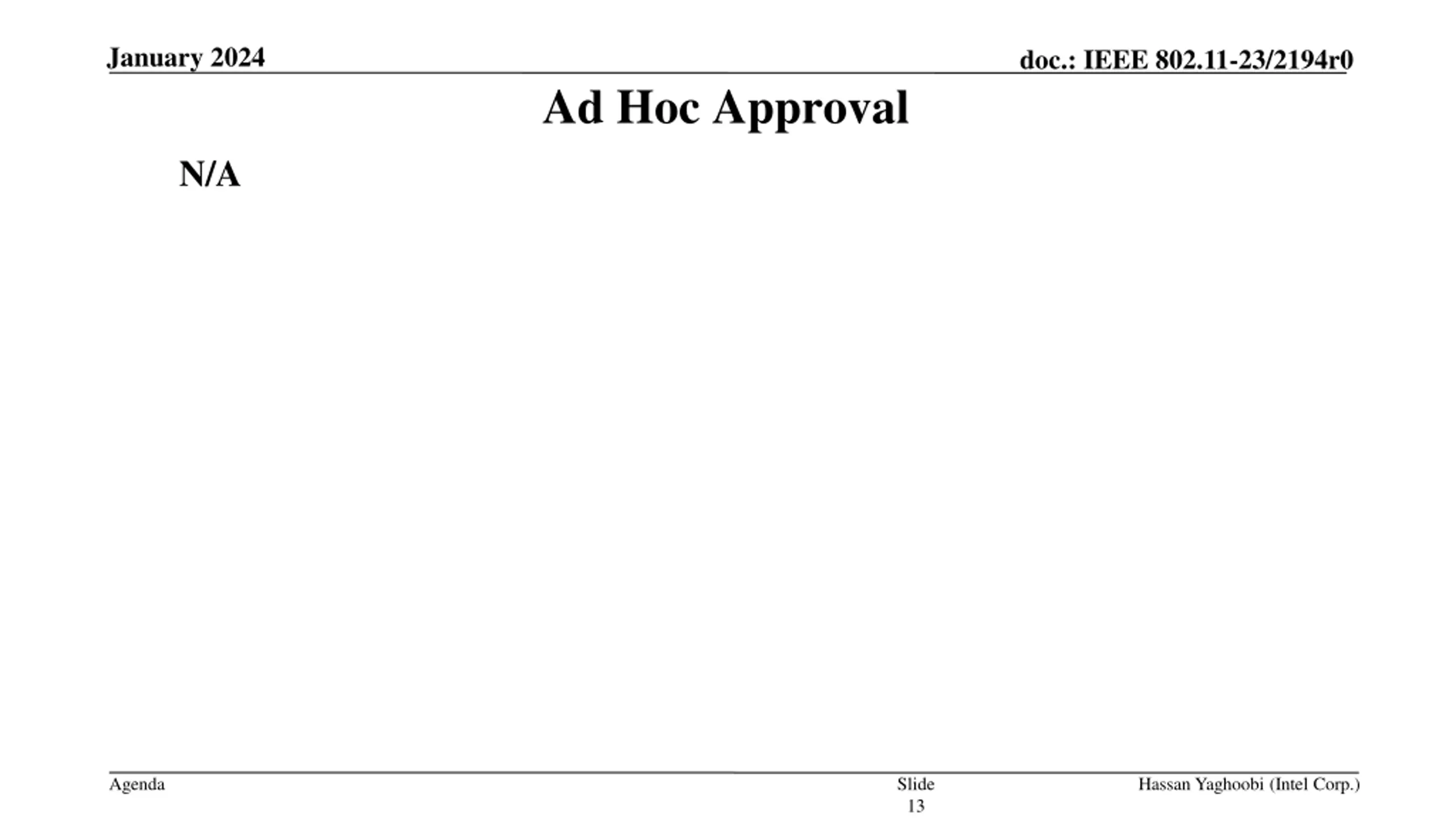 January 2024 doc.: IEEE 802.11-23/2194r0 Ad Hoc Approval N/A Agenda Slide 13 Hassan Yaghoobi (Intel Corp.)