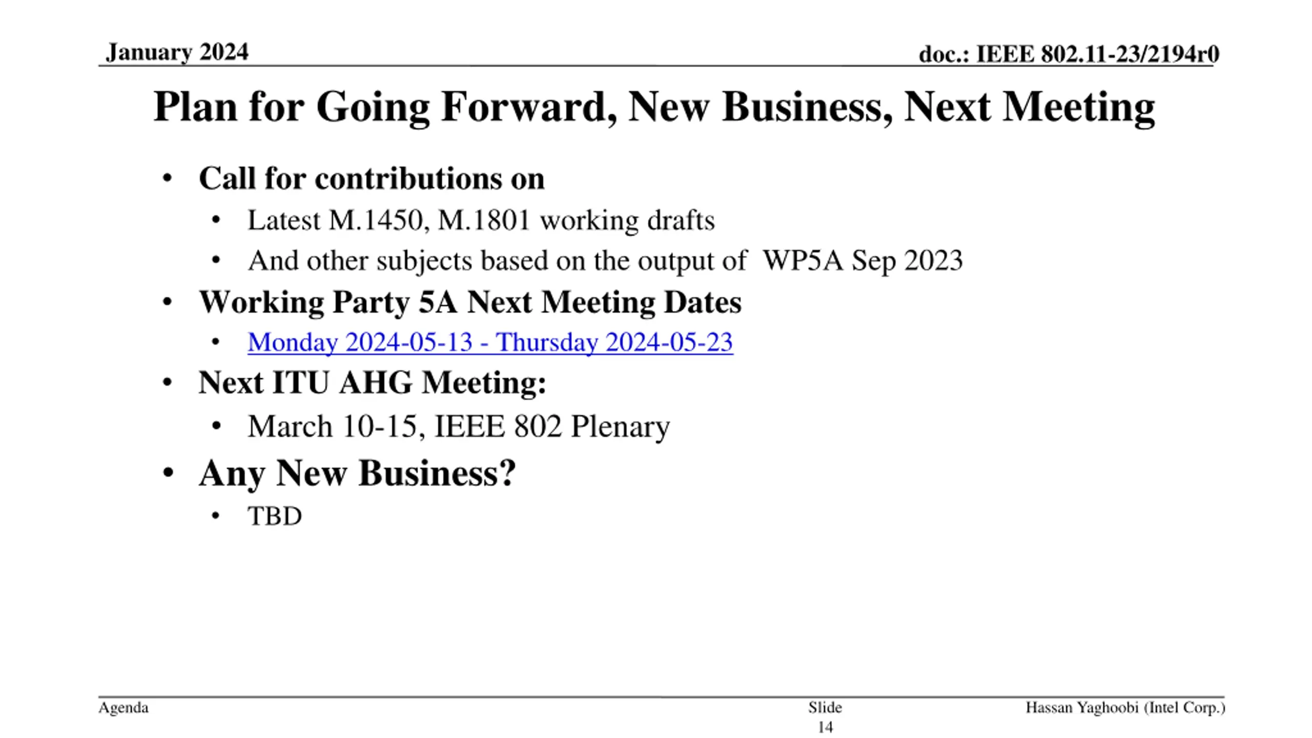 January 2024 doc.: IEEE 802.11-23/2194r0 Plan for Going Forward, New Business, Next Meeting Call for contributions on Latest M.1450, M.1801 working drafts And other subjects based on the output of WP5A Sep 2023 Working Party 5A Next Meeting Dates Monday 2024-05-13 - Thursday 2024-05-23 Next ITU AHG Meeting: March 10-15, IEEE 802 Plenary Any New Business? TBD Agenda Slide 14 Hassan Yaghoobi (Intel Corp.)
