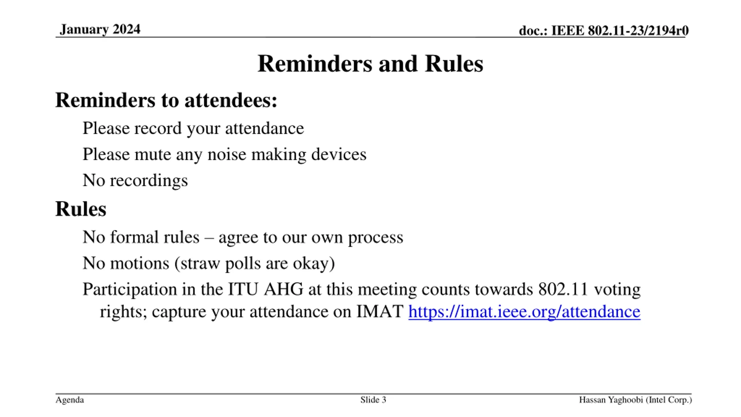 January 2024 doc.: IEEE 802.11-23/2194r0 Reminders and Rules Reminders to attendees: Please record your attendance Please mute any noise making devices No recordings Rules No formal rules agree to our own process No motions (straw polls are okay) Participation in the ITU AHG at this meeting counts towards 802.11 voting rights; capture your attendance on IMAT https://imat.ieee.org/attendance Agenda Slide 3 Hassan Yaghoobi (Intel Corp.)