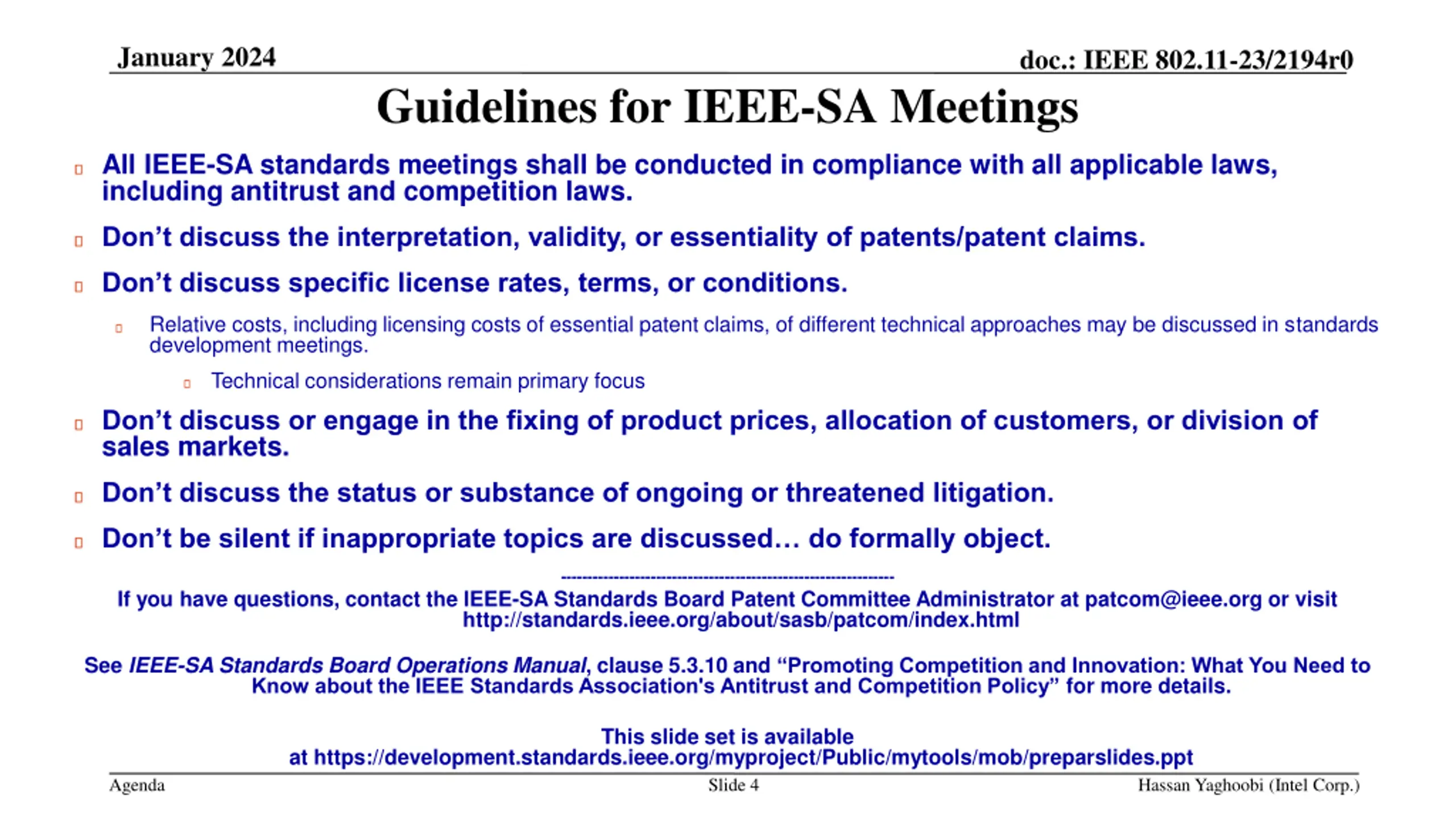 January 2024 doc.: IEEE 802.11-23/2194r0 Guidelines for IEEE-SA Meetings All IEEE-SA standards meetings shall be conducted in compliance with all applicable laws, including antitrust and competition laws. Don t discuss the interpretation, validity, or essentiality of patents/patent claims. Don t discuss specific license rates, terms, or conditions. Relative costs, including licensing costs of essential patent claims, of different technical approaches may be discussed in standards development meetings. Technical considerations remain primary focus Don t discuss or engage in the fixing of product prices, allocation of customers, or division of sales markets. Don t discuss the status or substance of ongoing or threatened litigation. Don t be silent if inappropriate topics are discussed do formally object. --------------------------------------------------------------- If you have questions, contact the IEEE-SA Standards Board Patent Committee Administrator at patcom@ieee.org or visit http://standards.ieee.org/about/sasb/patcom/index.html See IEEE-SA Standards Board Operations Manual, clause 5.3.10 and Promoting Competition and Innovation: What You Need to Know about the IEEE Standards Association's Antitrust and Competition Policy for more details. This slide set is available at https://development.standards.ieee.org/myproject/Public/mytools/mob/preparslides.ppt Agenda Slide 4 Hassan Yaghoobi (Intel Corp.)