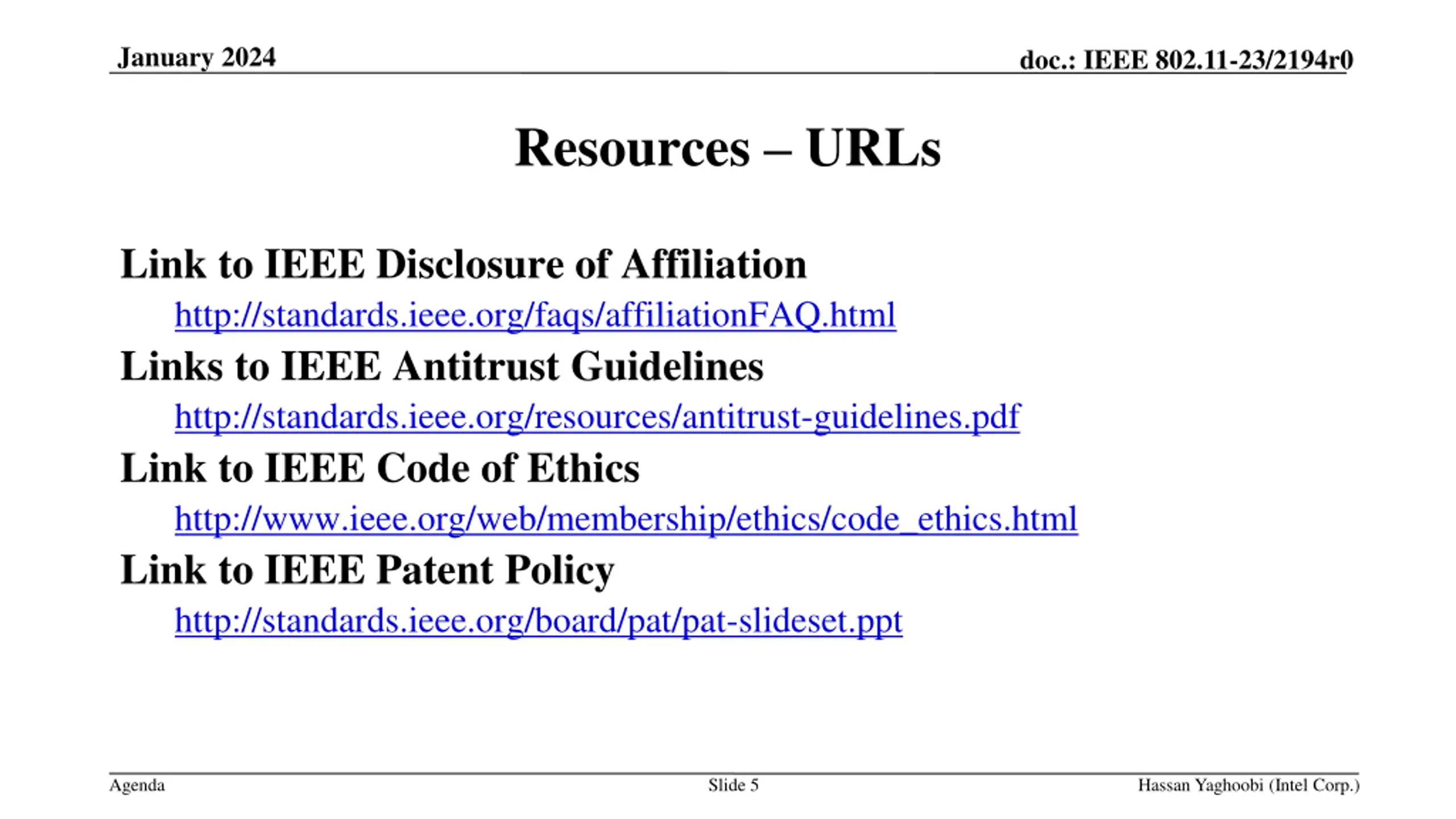 January 2024 doc.: IEEE 802.11-23/2194r0 Resources URLs Link to IEEE Disclosure of Affiliation http://standards.ieee.org/faqs/affiliationFAQ.html Links to IEEE Antitrust Guidelines http://standards.ieee.org/resources/antitrust-guidelines.pdf Link to IEEE Code of Ethics http://www.ieee.org/web/membership/ethics/code_ethics.html Link to IEEE Patent Policy http://standards.ieee.org/board/pat/pat-slideset.ppt Agenda Slide 5 Hassan Yaghoobi (Intel Corp.)