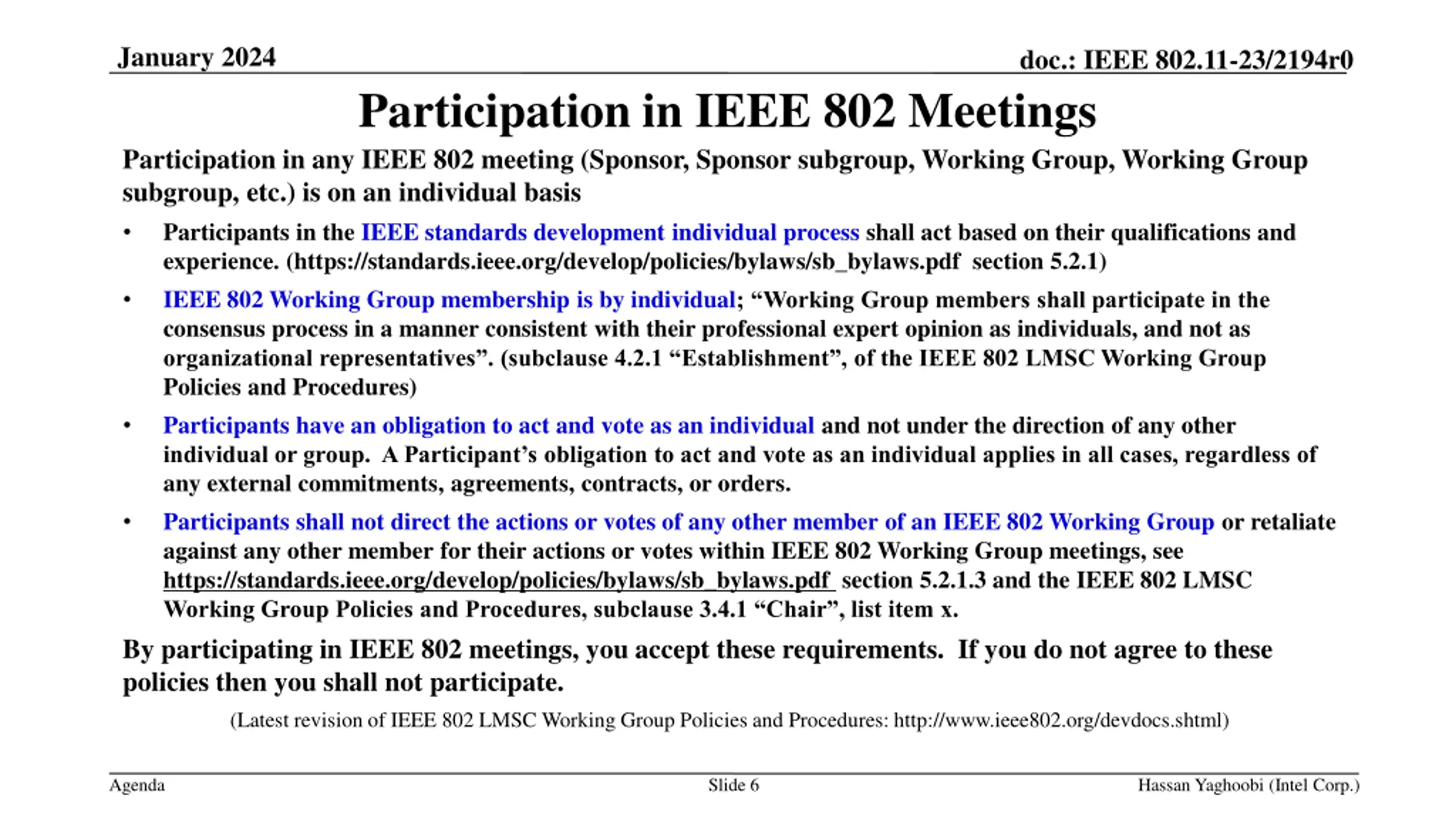 January 2024 doc.: IEEE 802.11-23/2194r0 Participation in IEEE 802 Meetings Participation in any IEEE 802 meeting (Sponsor, Sponsor subgroup, Working Group, Working Group subgroup, etc.) is on an individual basis Participants in the IEEE standards development individual process shall act based on their qualifications and experience. (https://standards.ieee.org/develop/policies/bylaws/sb_bylaws.pdf section 5.2.1) IEEE 802 Working Group membership is by individual; Working Group members shall participate in the consensus process in a manner consistent with their professional expert opinion as individuals, and not as organizational representatives . (subclause 4.2.1 Establishment , of the IEEE 802 LMSC Working Group Policies and Procedures) Participants have an obligation to act and vote as an individual and not under the direction of any other individual or group. A Participant s obligation to act and vote as an individual applies in all cases, regardless of any external commitments, agreements, contracts, or orders. Participants shall not direct the actions or votes of any other member of an IEEE 802 Working Group or retaliate against any other member for their actions or votes within IEEE 802 Working Group meetings, see https://standards.ieee.org/develop/policies/bylaws/sb_bylaws.pdf section 5.2.1.3 and the IEEE 802 LMSC Working Group Policies and Procedures, subclause 3.4.1 Chair , list item x. By participating in IEEE 802 meetings, you accept these requirements. If you do not agree to these policies then you shall not participate. (Latest revision of IEEE 802 LMSC Working Group Policies and Procedures: http://www.ieee802.org/devdocs.shtml) Agenda Slide 6 Hassan Yaghoobi (Intel Corp.)