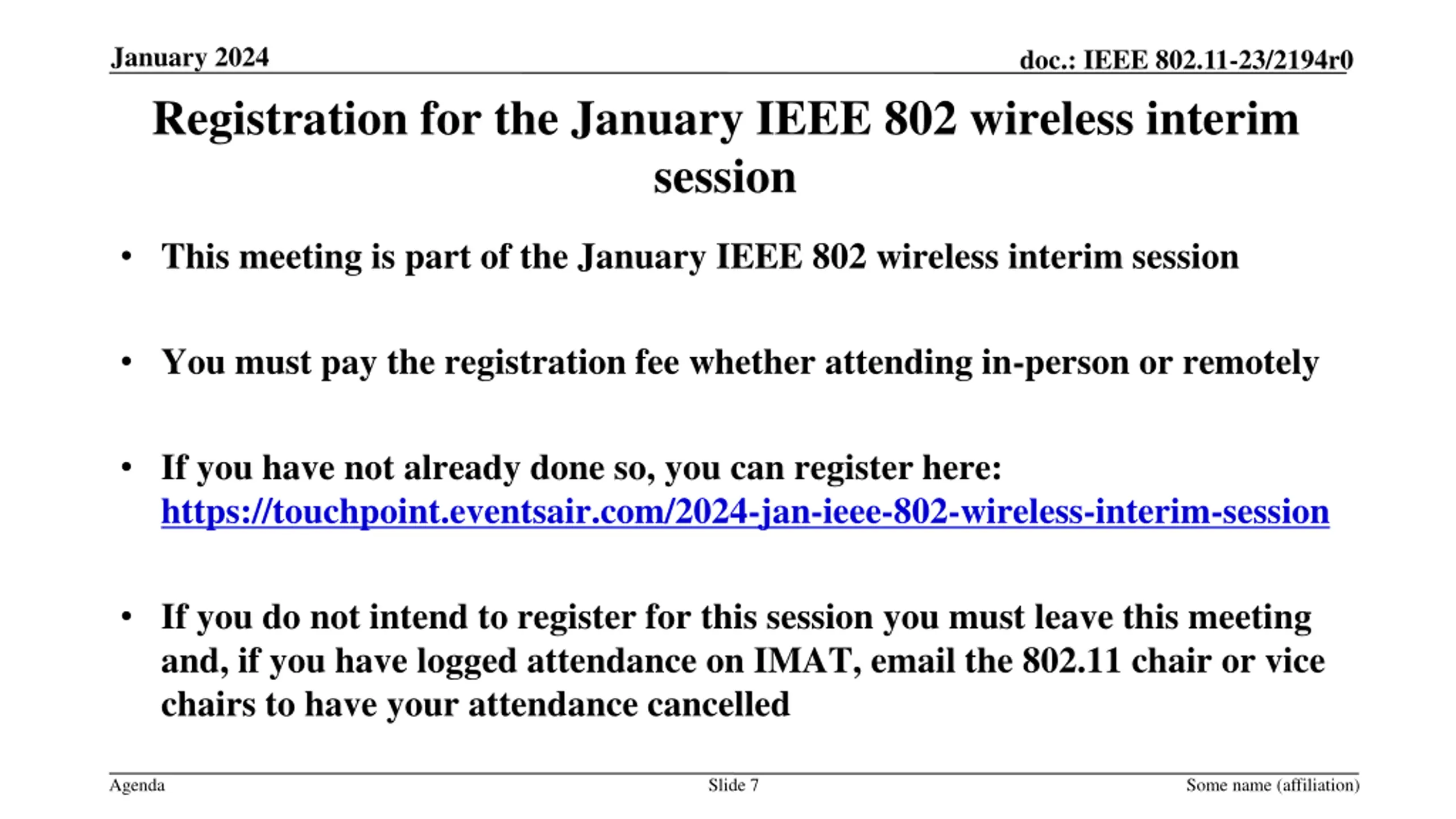 January 2024 doc.: IEEE 802.11-23/2194r0 Registration for the January IEEE 802 wireless interim session This meeting is part of the January IEEE 802 wireless interim session You must pay the registration fee whether attending in-person or remotely If you have not already done so, you can register here: https://touchpoint.eventsair.com/2024-jan-ieee-802-wireless-interim-session If you do not intend to register for this session you must leave this meeting and, if you have logged attendance on IMAT, email the 802.11 chair or vice chairs to have your attendance cancelled Agenda Slide 7 Some name (affiliation)