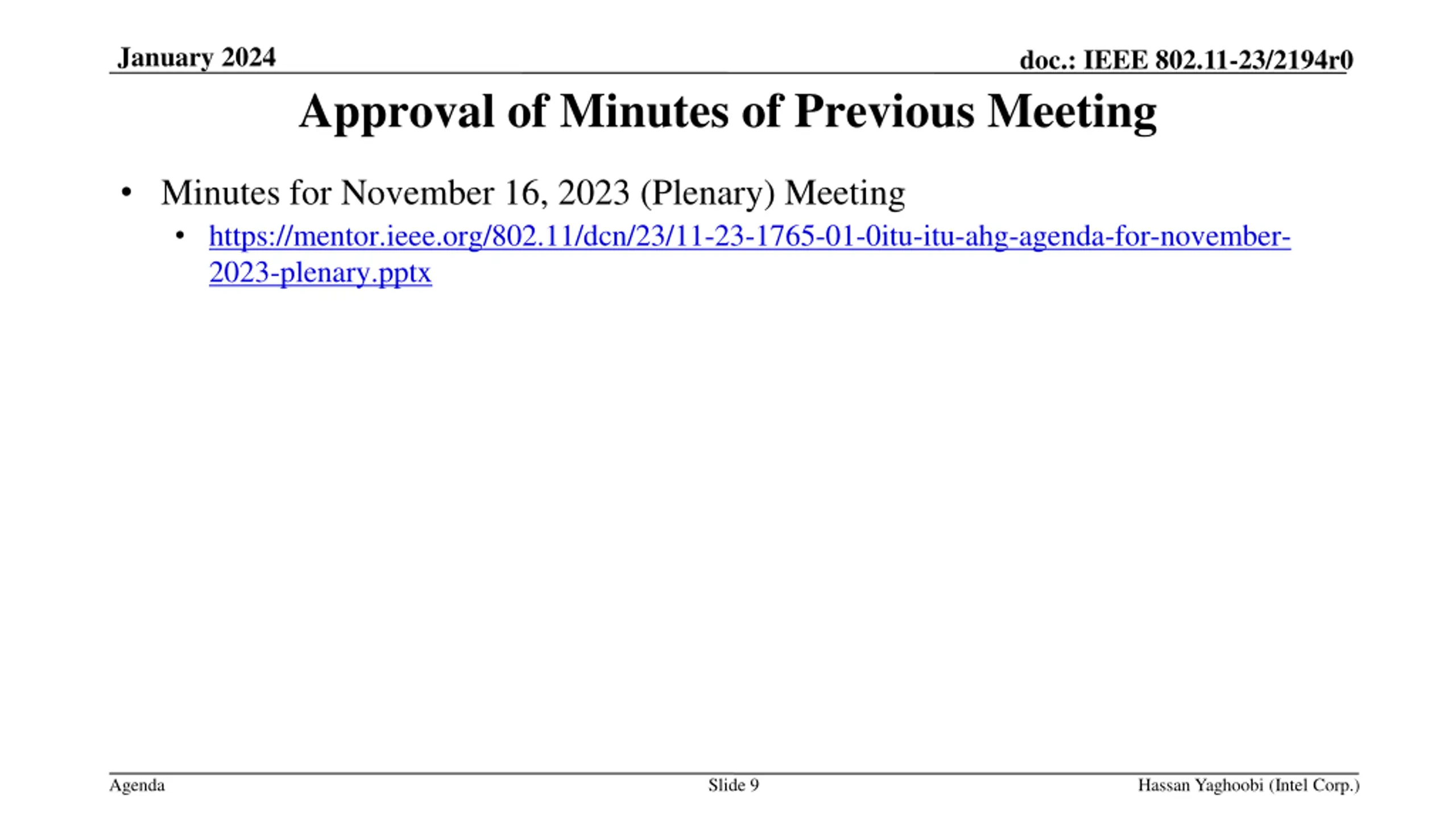 January 2024 doc.: IEEE 802.11-23/2194r0 Approval of Minutes of Previous Meeting Minutes for November 16, 2023 (Plenary) Meeting https://mentor.ieee.org/802.11/dcn/23/11-23-1765-01-0itu-itu-ahg-agenda-for-november- 2023-plenary.pptx Agenda Slide 9 Hassan Yaghoobi (Intel Corp.)