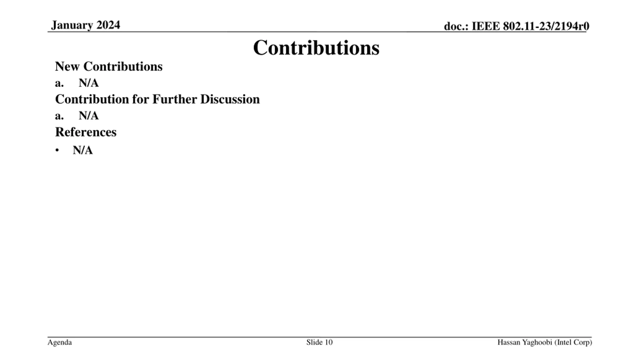 January 2024 doc.: IEEE 802.11-23/2194r0 Contributions New Contributions a. N/A Contribution for Further Discussion a. N/A References N/A Agenda Slide 10 Hassan Yaghoobi (Intel Corp)