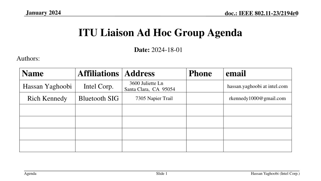 January 2024 doc.: IEEE 802.11-23/2194r0 ITU Liaison Ad Hoc Group Agenda Date: 2024-18-01 Authors: Name Affiliations Address Phone email 3600 Juliette Ln Santa Clara, CA 95054 7305 Napier Trail Hassan Yaghoobi Intel Corp. hassan.yaghoobi at intel.com Rich Kennedy Bluetooth SIG rkennedy1000@gmail.com Agenda Slide 1 Hassan Yaghoobi (Intel Corp.)