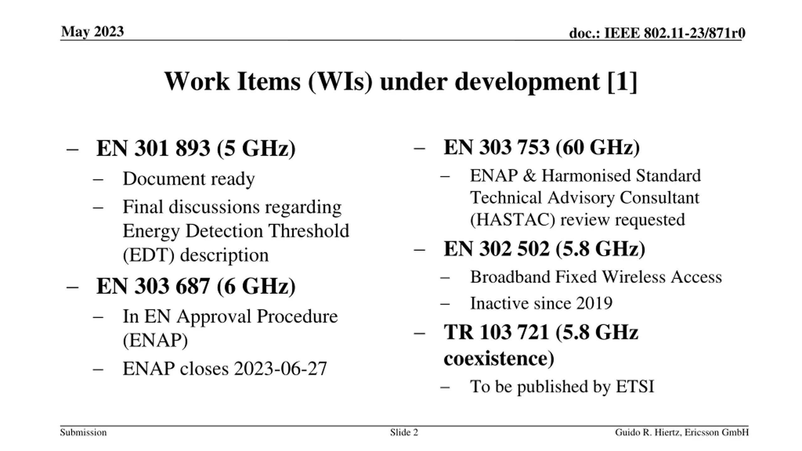 May 2023 doc.: IEEE 802.11-23/871r0 Work Items (WIs) under development [1] EN 301 893 (5 GHz) Document ready Final discussions regarding Energy Detection Threshold (EDT) description EN 303 687 (6 GHz) In EN Approval Procedure (ENAP) ENAP closes 2023-06-27 EN 303 753 (60 GHz) ENAP & Harmonised Standard Technical Advisory Consultant (HASTAC) review requested EN 302 502 (5.8 GHz) Broadband Fixed Wireless Access Inactive since 2019 TR 103 721 (5.8 GHz coexistence) To be published by ETSI Submission Slide 2 Guido R. Hiertz, Ericsson GmbH