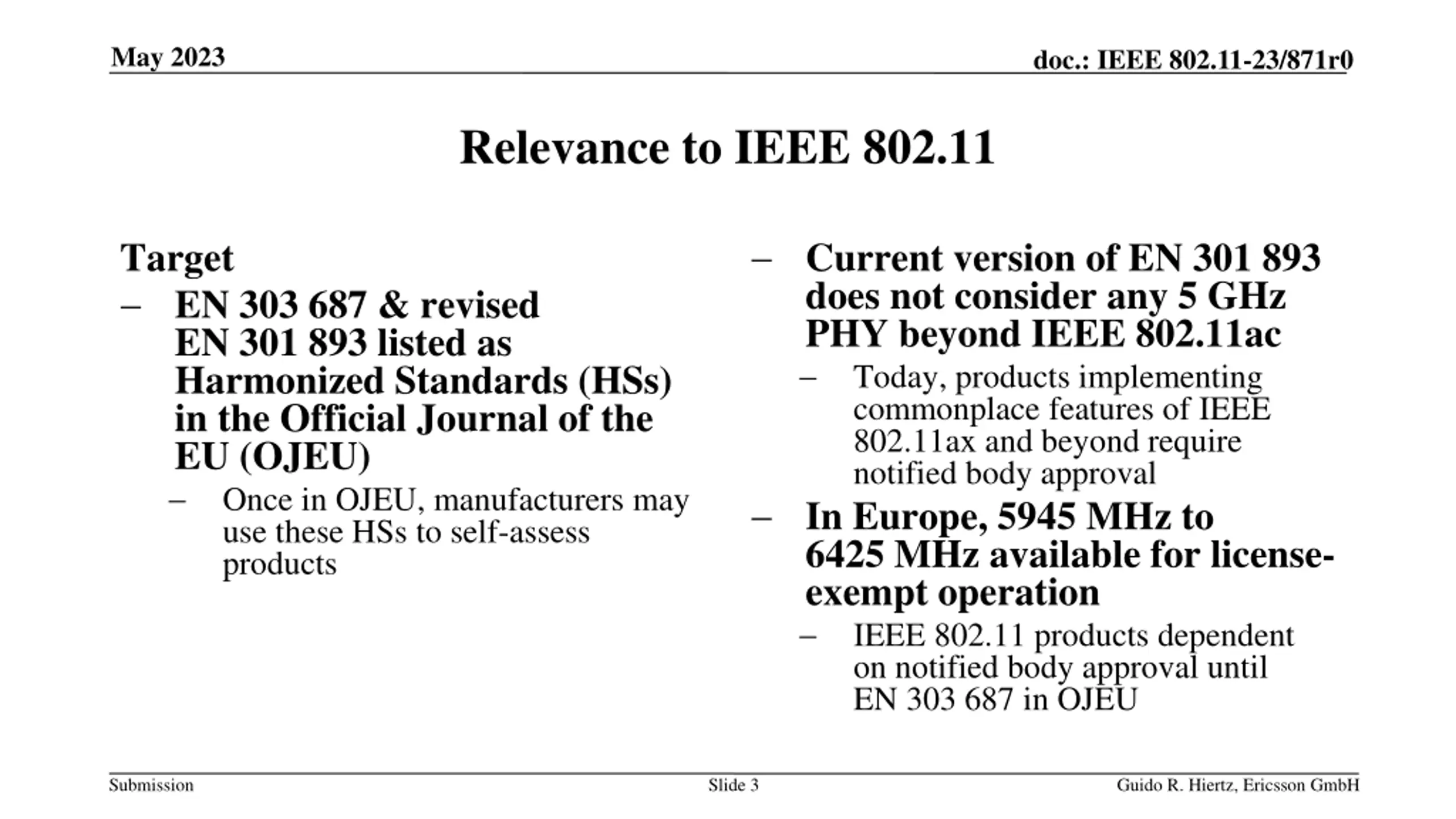 May 2023 doc.: IEEE 802.11-23/871r0 Relevance to IEEE 802.11 Current version of EN 301 893 does not consider any 5 GHz PHY beyond IEEE 802.11ac Today, products implementing commonplace features of IEEE 802.11ax and beyond require notified body approval In Europe, 5945 MHz to 6425 MHz available for license- exempt operation IEEE 802.11 products dependent on notified body approval until EN 303 687 in OJEU Target EN 303 687 & revised EN 301 893 listed as Harmonized Standards (HSs) in the Official Journal of the EU (OJEU) Once in OJEU, manufacturers may use these HSs to self-assess products Submission Slide 3 Guido R. Hiertz, Ericsson GmbH