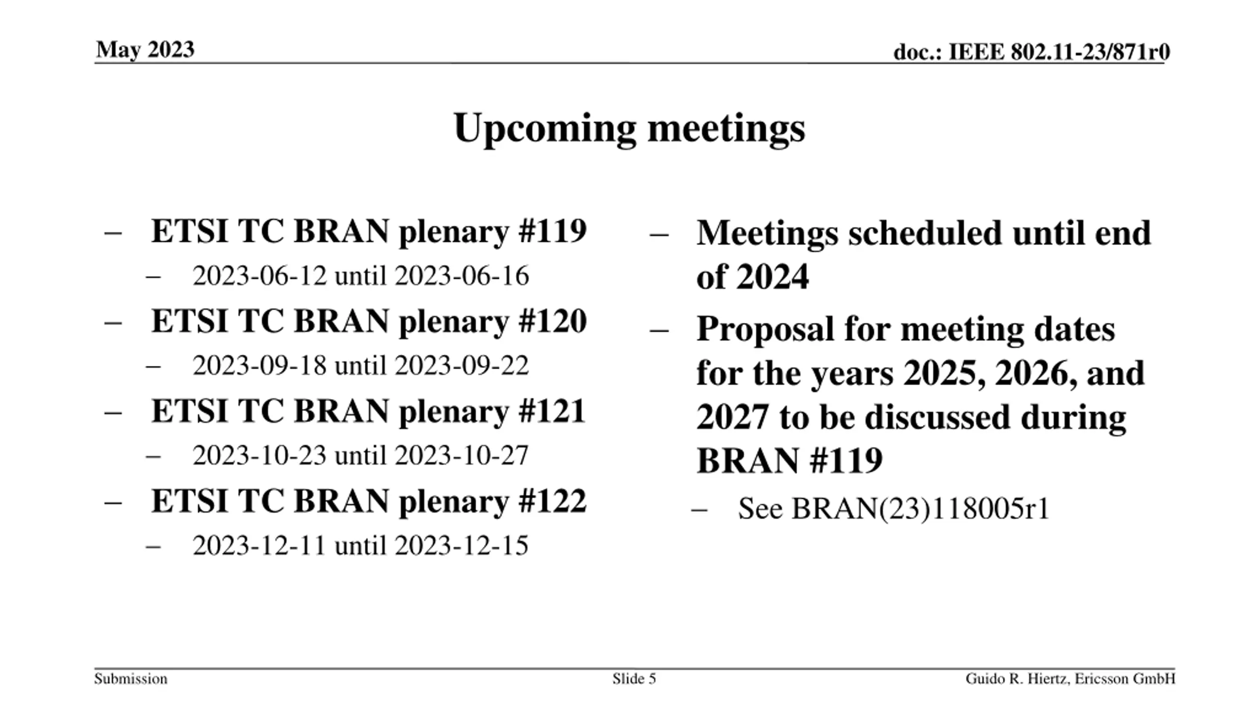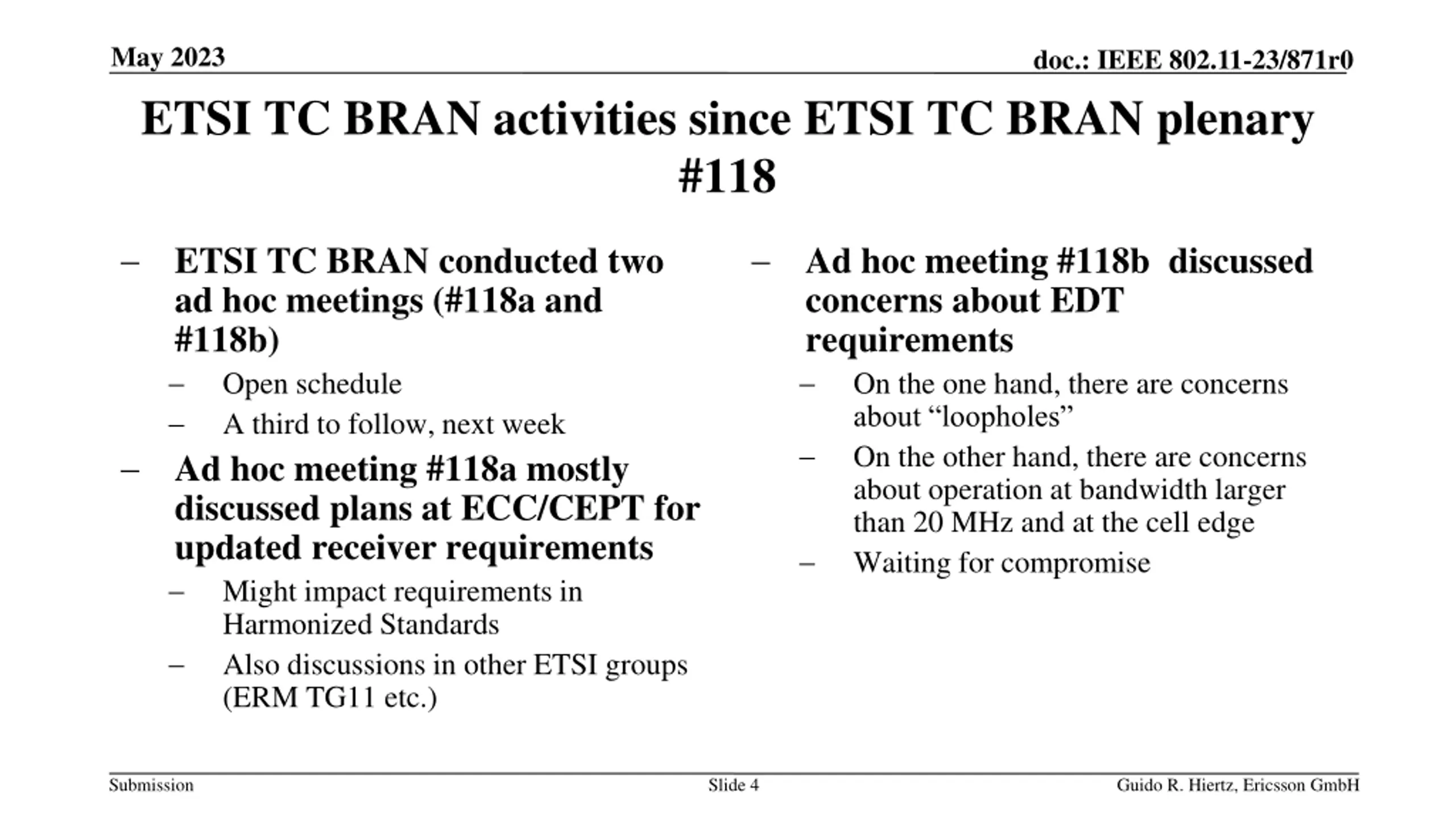 May 2023 doc.: IEEE 802.11-23/871r0 ETSI TC BRAN news Date: 2023-05-16 Authors: Name Guido R. Hiertz Affiliations Ericsson GmbH Address Ericsson Allee 1 52134 Herzogenrath Germany Phone email hiertz@ieee.org Submission Slide 1 Guido R. Hiertz, Ericsson GmbH