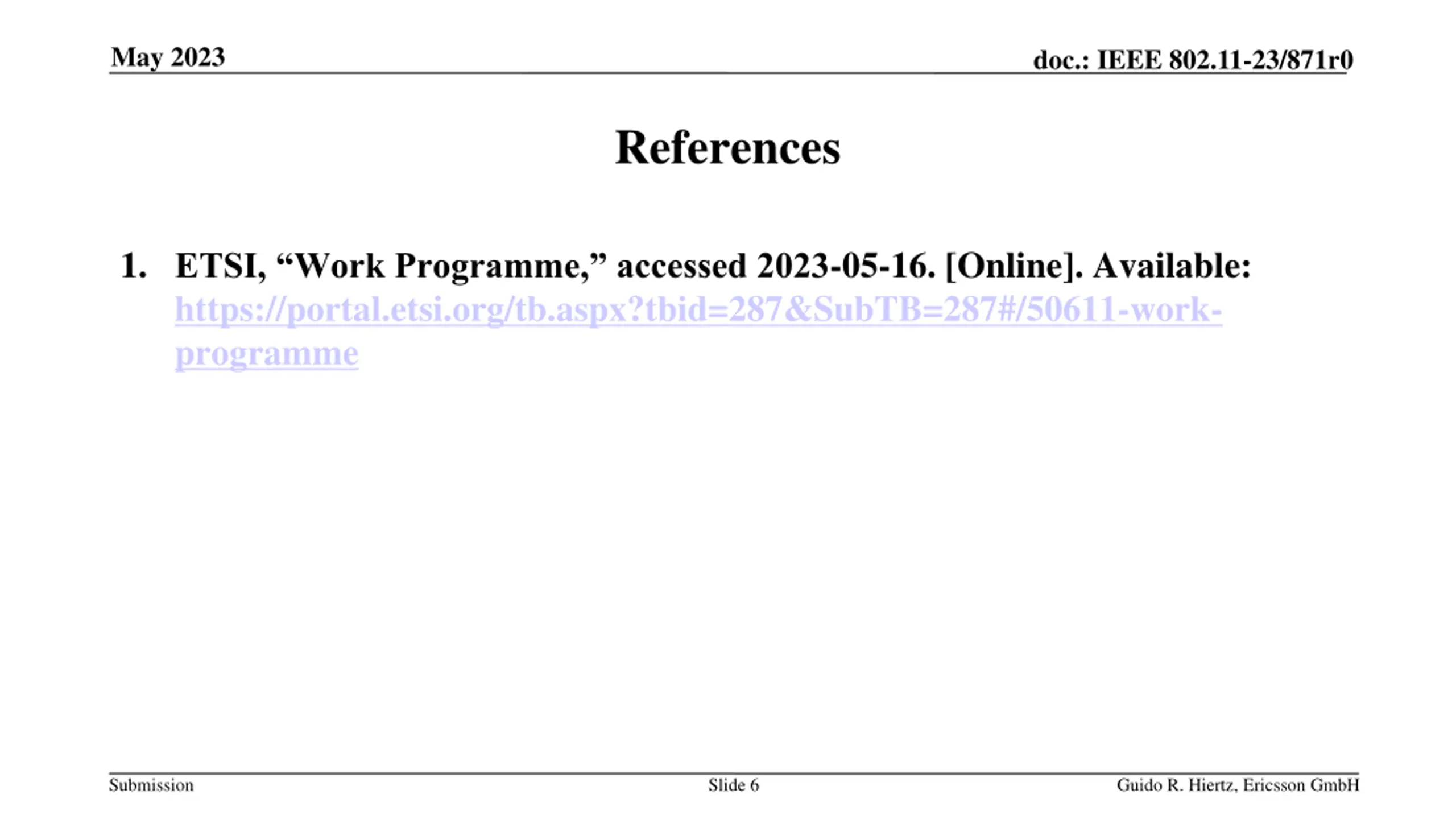 May 2023 doc.: IEEE 802.11-23/871r0 References 1. ETSI, Work Programme, accessed 2023-05-16. [Online]. Available: https://portal.etsi.org/tb.aspx?tbid=287&SubTB=287#/50611-work- programme Submission Slide 6 Guido R. Hiertz, Ericsson GmbH