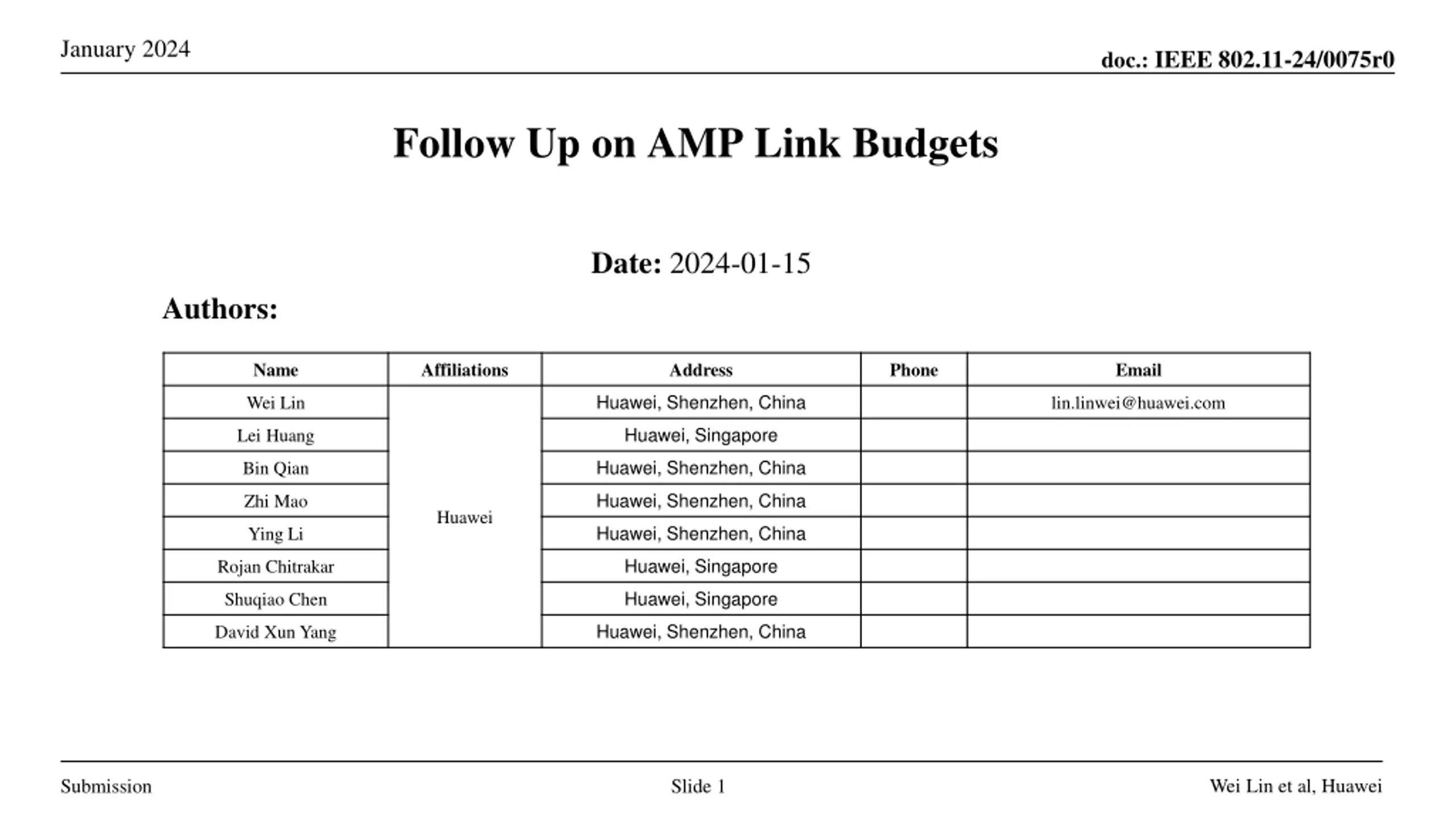 January 2024 doc.: IEEE 802.11-24/0075r0 Follow Up on AMP Link Budgets Date: 2024-01-15 Authors: Name Affiliations Address Phone Email Huawei, Shenzhen, China Wei Lin lin.linwei@huawei.com Huawei, Singapore Lei Huang Huawei, Shenzhen, China Bin Qian Huawei, Shenzhen, China Zhi Mao Huawei Huawei, Shenzhen, China Ying Li Huawei, Singapore Rojan Chitrakar Huawei, Singapore Shuqiao Chen Huawei, Shenzhen, China David Xun Yang Wei Lin et al, Huawei Submission Slide 1